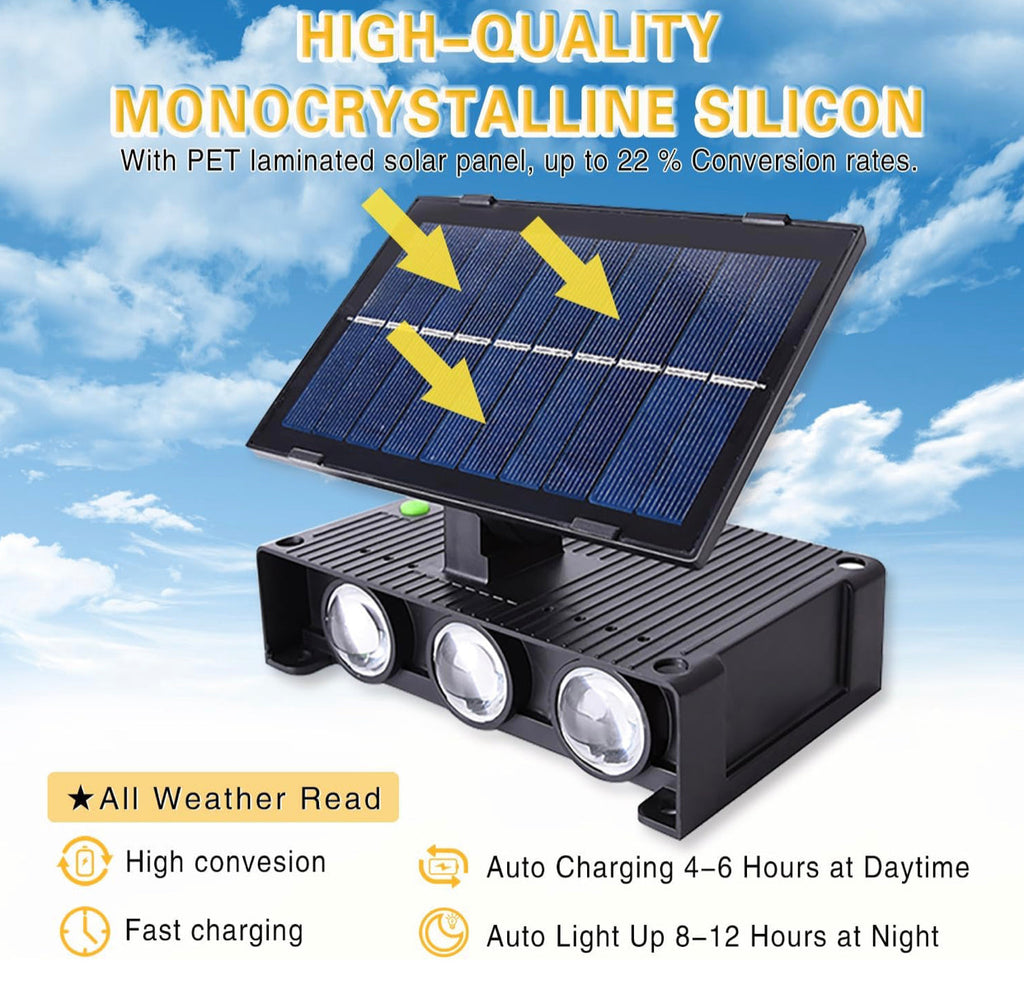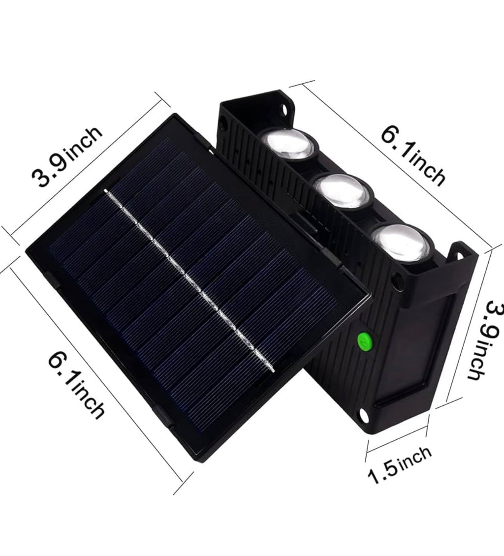 Solar Up and Down Wall Lights Outdoor:The 3 LED beams of lights at the top and bottom in the same direction are interlaced,focusing lenses illumincate brighter and farther than normal lenses perfect.Six 1W LED beads,3 light colors adjustable,The 90 degree adjustable solar panel can better absorb sunlight.