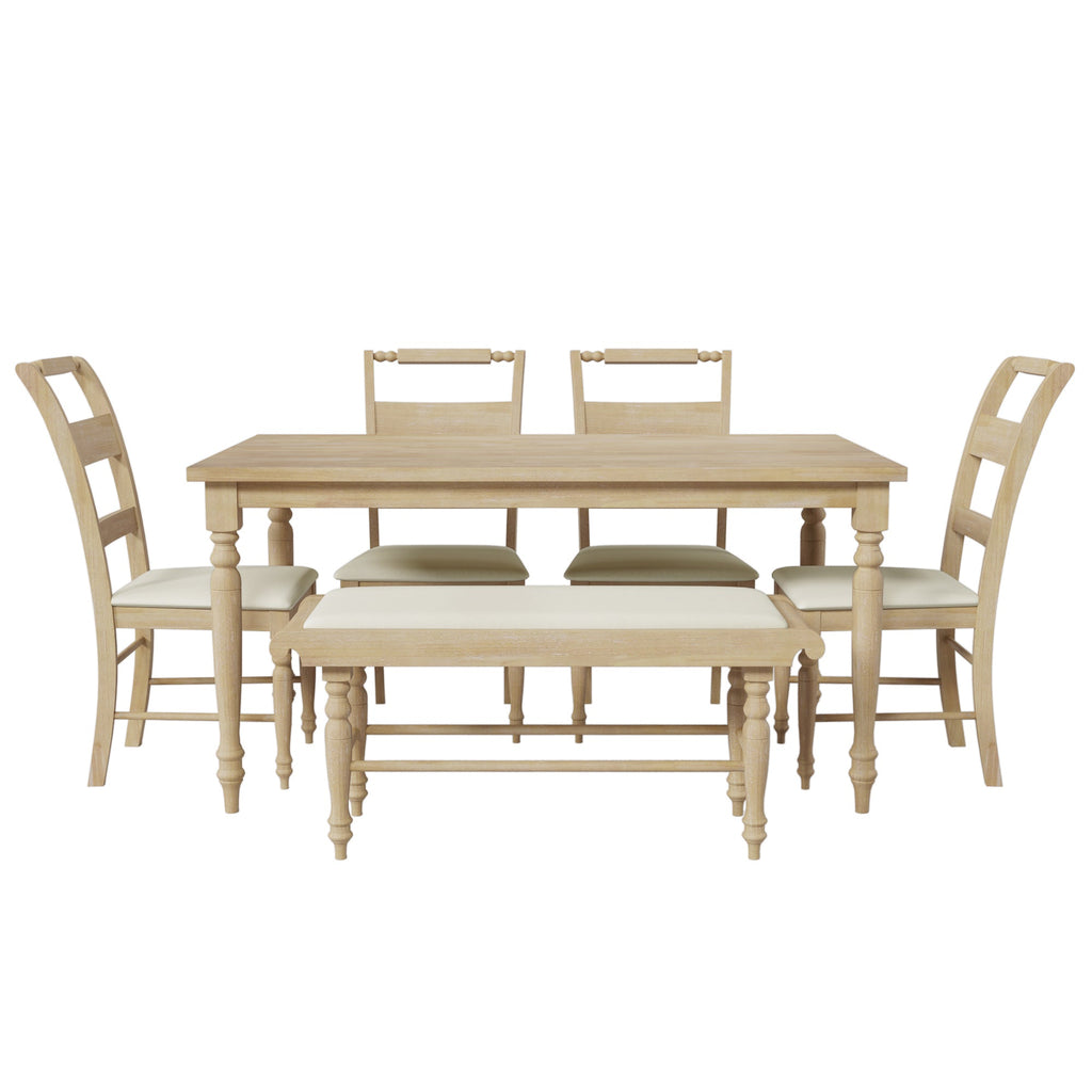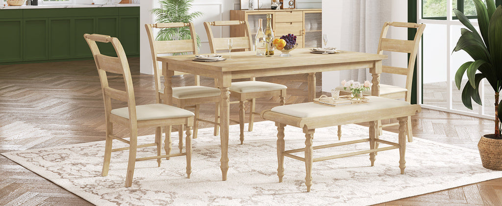 6-peice Dining Set with Turned Legs, Kitchen Table Set with Upholstered Dining Chairs and Bench,Retro Style, Natural