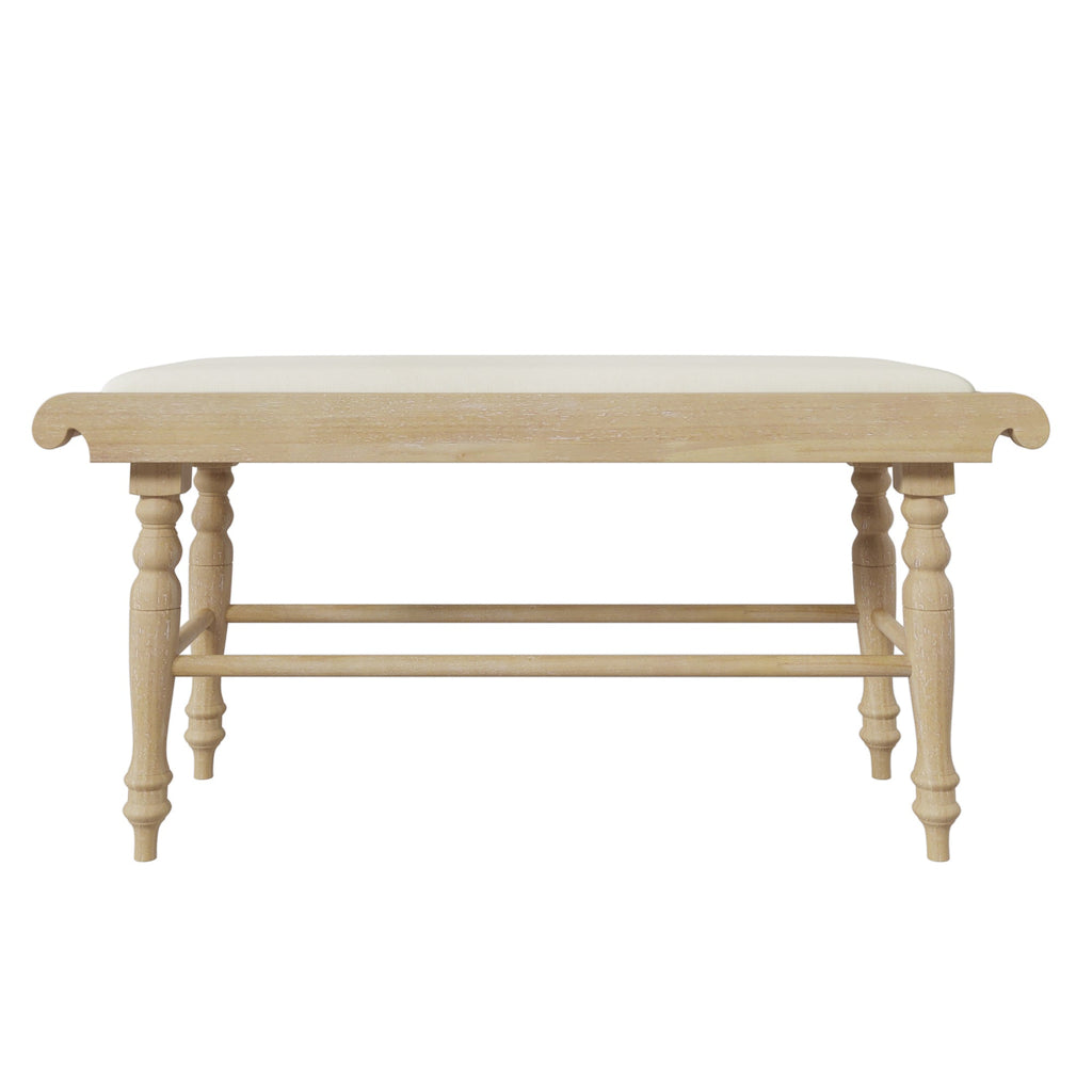 This bench is designed with a built-in cushion for added comfort, turned legs for a stylish touch, and a turned cap rail for extra detailing. The integrated cushion enhances seating comfort, while the turned legs and cap rail contribute to the bench's overall aesthetic appeal.