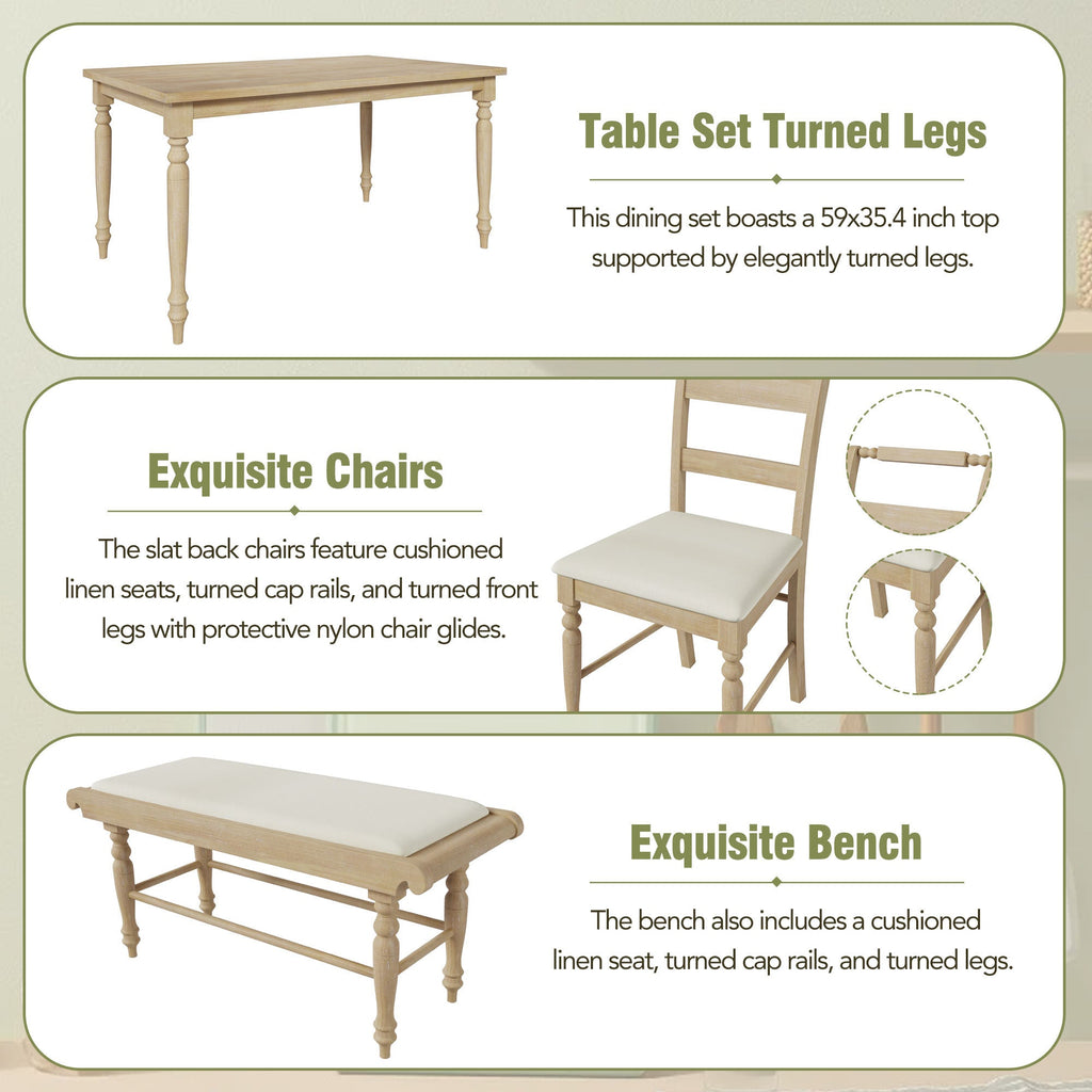 • [Retro Dining Table Set Turned Legs] This dining set boasts a 59x35.4-inch top supported by elegantly turned legs. The slat back chairs feature cushioned linen seats, turned cap rails, and turned front legs with protective nylon chair glides. The bench also includes a cushioned linen seat, turned cap rails, and turned legs. Together, they create a charmingly vintage atmosphere for your dining space.