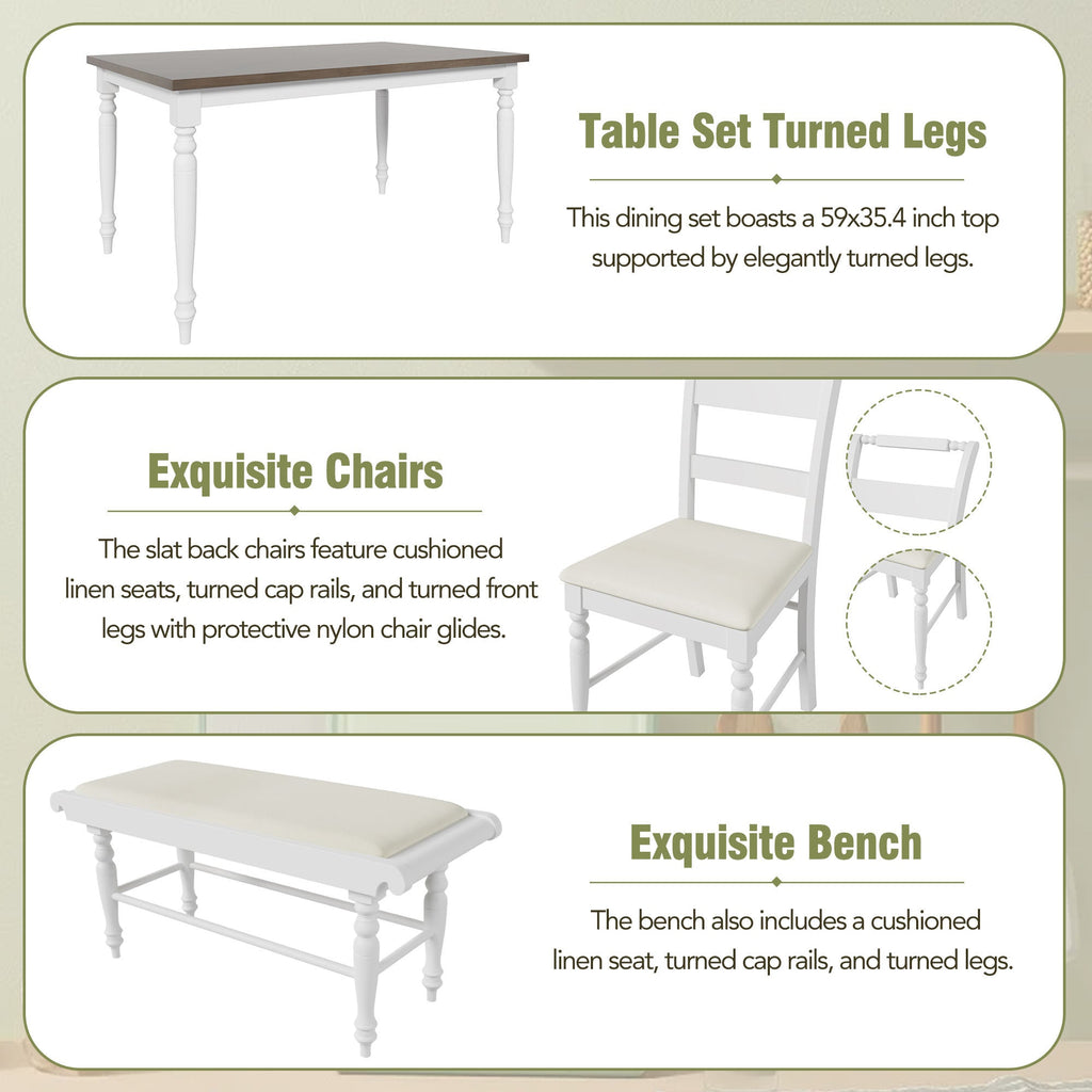 - [Retro Dining Table Set Turned Legs] This dining set boasts a 59x35.4-inch top supported by elegantly turned legs. The slat back chairs feature cushioned linen seats, turned cap rails, and turned front legs with protective nylon chair glides. The bench also includes a cushioned linen seat, turned cap rails, and turned legs. Together, they create a charmingly vintage atmosphere for your dining space.