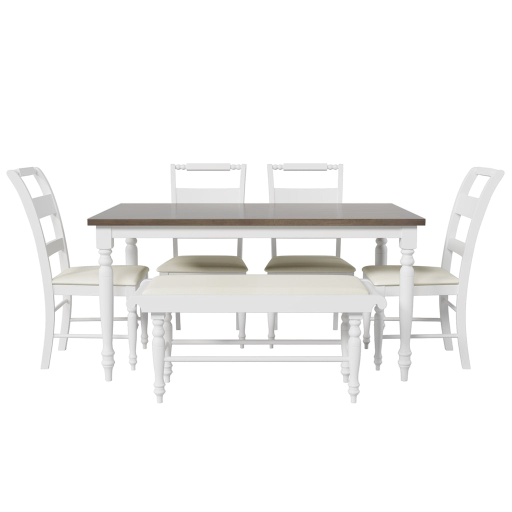 | Highlights | Solid Wood // Rectangular Tabletop // Turned Legs // 4 Upholstered Chairs// Slat Back // Turned Cap Rail // Bulit-in Bench Cushion // Seatings for 6// Two Colors Available // Retro Style |