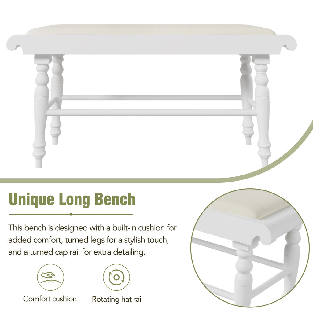 - [Unique Long Bench] This bench is designed with a built-in cushion for added comfort, turned legs for a stylish touch, and a turned cap rail for extra detailing. The integrated cushion enhances seating comfort, while the turned legs and cap rail contribute to the bench's overall aesthetic appeal, creating a well-crafted and visually appealing furniture piece.
