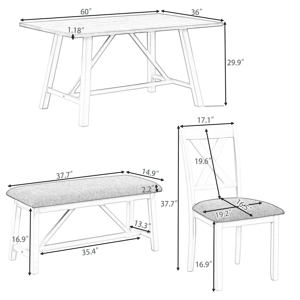 - Dimensions: Dining table: 60 x 36 x 29.9 inches (L x W x H). Dining Chair: 19.2 x 17.1 x 37.7 inches (L x W x H). Bench: 37.7 x 14.9 x 16.9 inches (L x W x H). Please feel free to contact our customer service with any questions.Warm notice: Product's color may slightly differ from photo due to the light or your monitor’s display.