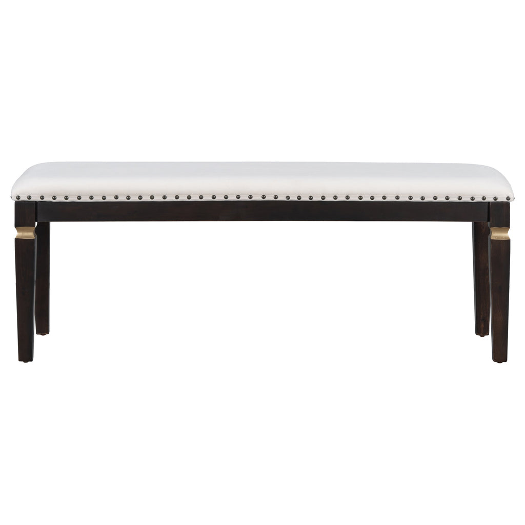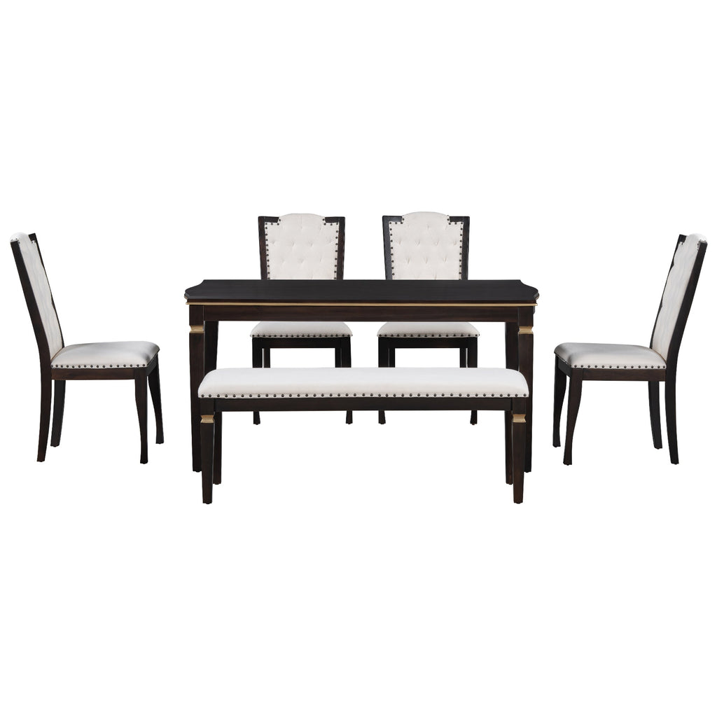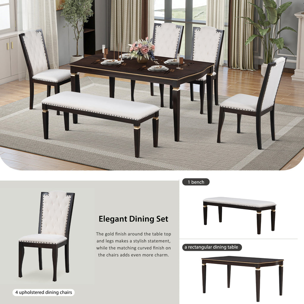 - Elegant Dining Set: Embrace high-end elegance with this 6-piece wood dining table set for 6, featuring a rectangular table with a finely crafted turned top and a gold finish, exuding a sophisticated and refined atmosphere. Complete with 4 upholstered chairs and a bench, this dining table set for 6 is perfect for hosting dinner parties with friends or enjoying daily meals with the family, making a dining room table and chairs set of 6 an essential addition to your home.