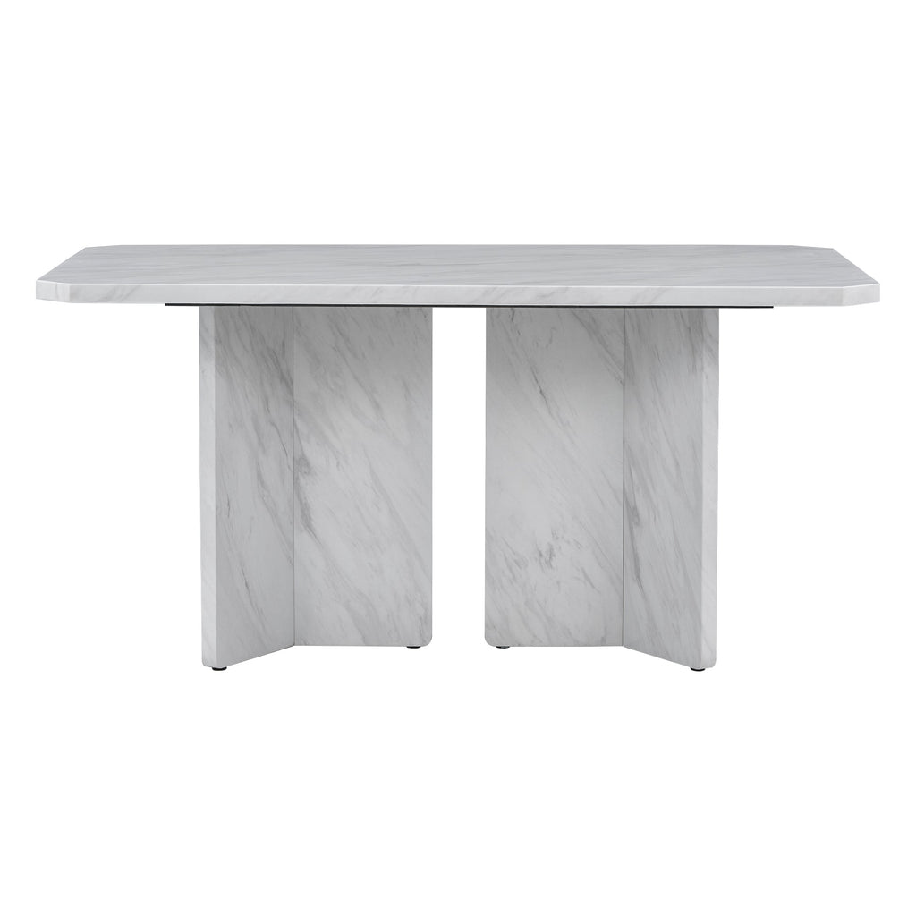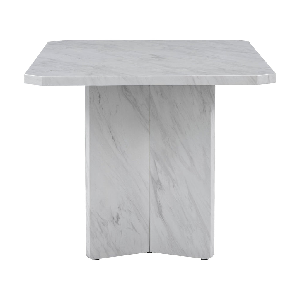 In the unique design of irregular octagonal tabletop and two tri leg pedestal bases, the dining set invites a sense of endless sophistication and effortless elegance. The smooth high-gloss faux marble table-top, making it an outstanding supplement to your family. The foot pads under the leg pedestal bases can be adjusted to make the table more stable and meantime prevent the floor from being scratching. With simple lines of tabletop and curved shapes of backrest, it shows the beauty of personality and fashion, offering a sophisticated spot for dining and entertaining.