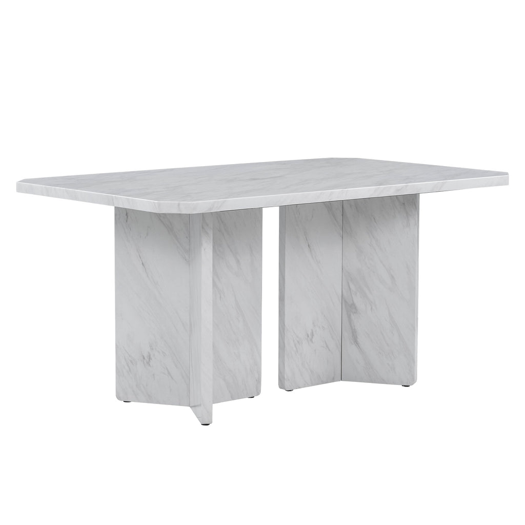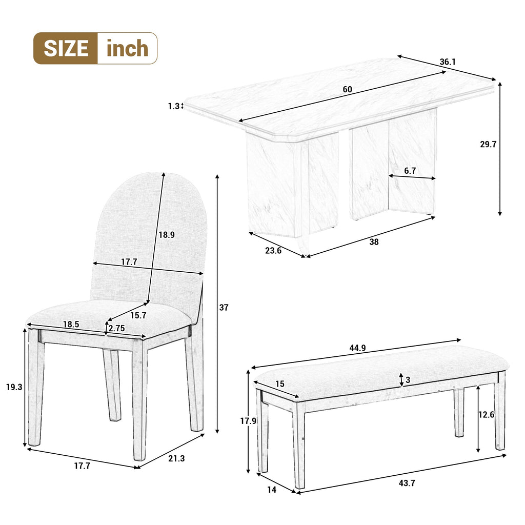 TREXM 6-Piece Modern Style Dining Set with Faux Marble Table and 4 Upholstered Dining Chairs & 1 Bench (White)