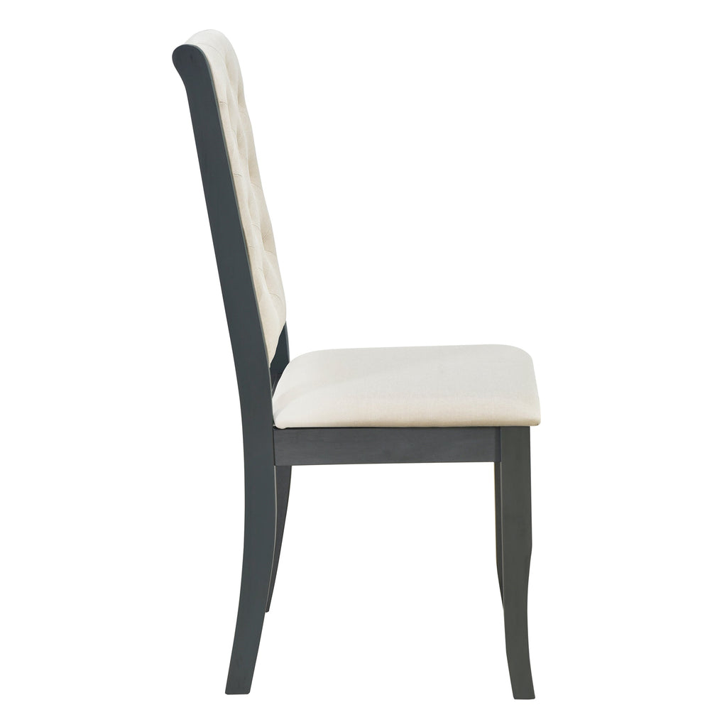 4.Satisfying details The natural wood grain of the tabletop of this dining table set complements a variety of unique interior styles by blending in seamlessly. The foam--covered linen seat backs and cushions of these chairs can offer comfortable experience and cause no skin irritation. The chair back and cushion are also ornamented with tufted buttons, which make the dining set less homogeneous and more distinctive.