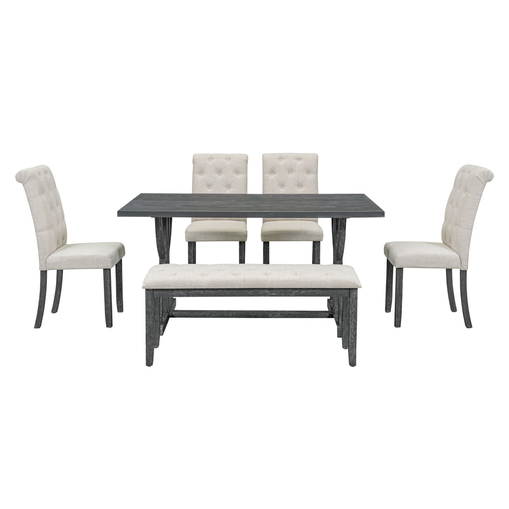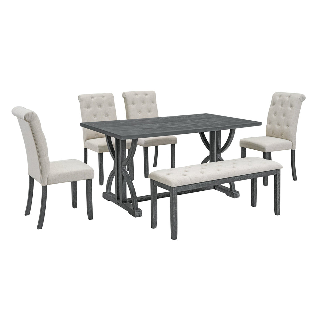 6-Piece Retro Rectangular Dining Table Set, Table with Unique Legs and 4 Upholstered Chairs & 1 Bench for Dining Room and Kitchen (Gray Wash)