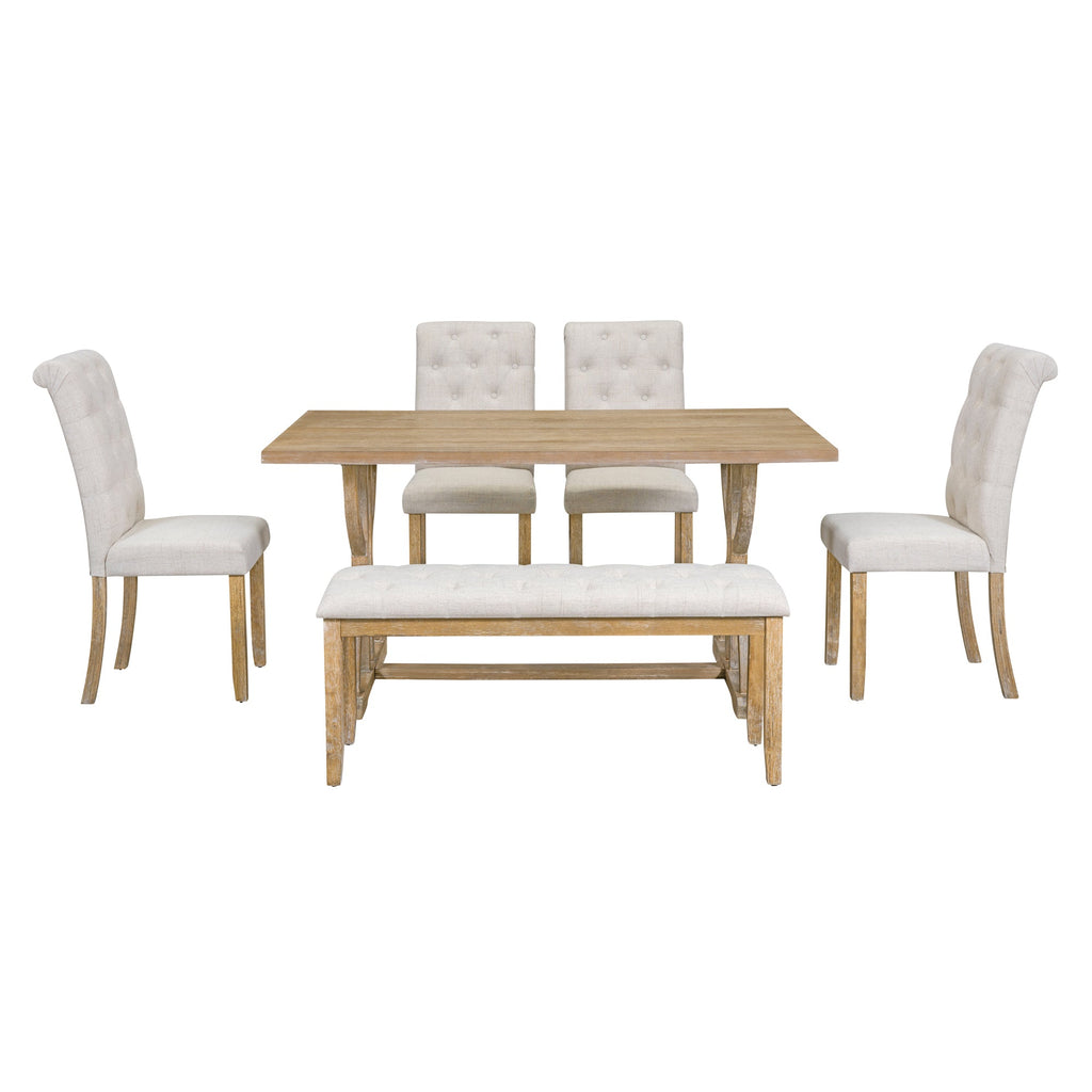 - The 6-piece dining table set with its retro and elegant appearance will definitively redefine your dining and living space. The tabletop is in a simple rectangular design, and its combination of rigidity and softness makes the artistic sense stronger. Its timeworn planked ash top creates a unique two-tone contrast, while special designed legs and stretcher provide a sturdy foundation. Four solid wood dining chairs and one matching dining bench complete this excellent combo item.