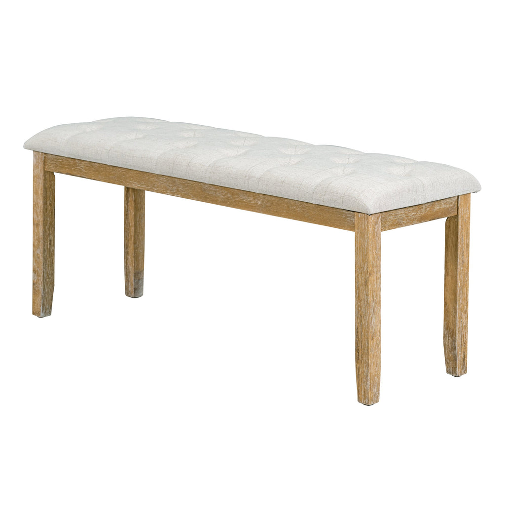 - This dining set includes one table, four chairs and one dining bench, seating up to 6. The dining table can perfectly accommodate your family and guests without making you feel crowded. The spacious tabletop is not only much advantageous for the placement of dishes and other miscellaneous things, such as vases, fruit bowls, candles, etc, beautifully meeting your meal needs. Chairs, as well as the dining bench, are equipped with foam-padded cushions and beige fabric for superb comfort.