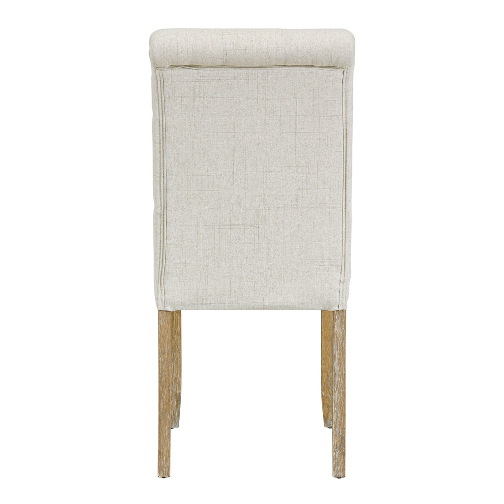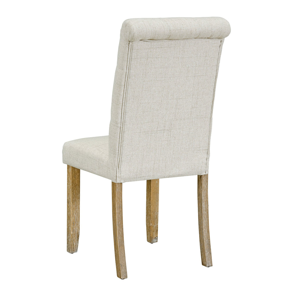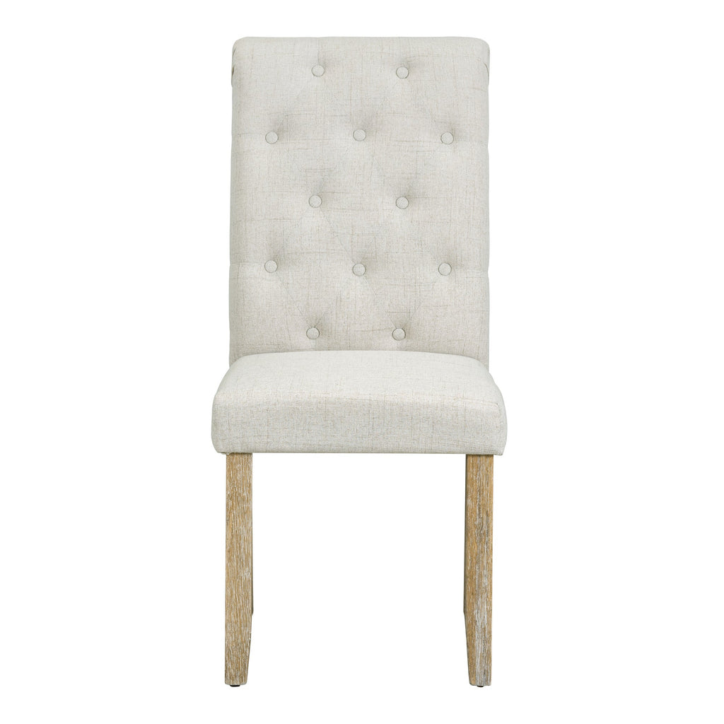 - The natural wood wash and grey finish add a distinctly rustic look that easily updates any household. Special symmetrical pattern design for table legs and button-tufting design of the seating set undoubtedly showcase a classic look, featuring an elegant and retro flair. Thick upholstered backrests of chair sets are in line with ergonomic design, thus bringing superb comfort. Whether used for chic dinner parties or casual family dinners, the dining set is sure to elevate any dining experience.