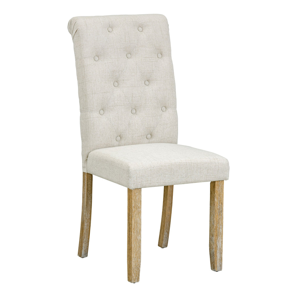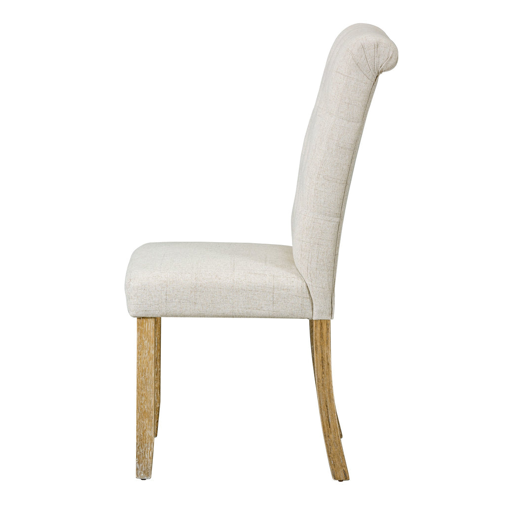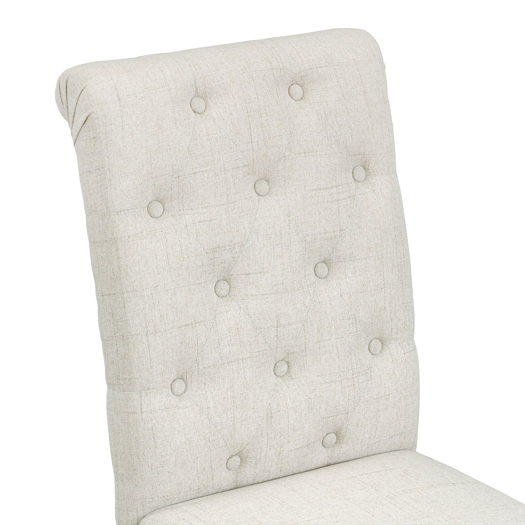 - The natural wood wash and grey finish add a distinctly rustic look that easily updates any household. Special symmetrical pattern design for table legs and button-tufting design of the seating set undoubtedly showcase a classic look, featuring an elegant and retro flair. Thick upholstered backrests of chair sets are in line with ergonomic design, thus bringing superb comfort. Whether used for chic dinner parties or casual family dinners, the dining set is sure to elevate any dining experience.