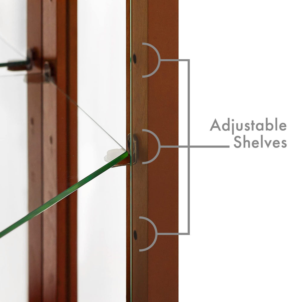 With plenty of space for all your collectables, the 4 adjustable tempered glass shelves allow you to customize the display cabinet for the perfect fit. 2 wood shelves are part of the main display cabinet frame and are not adjustable. Each shelf can hold up to 15 lbs.