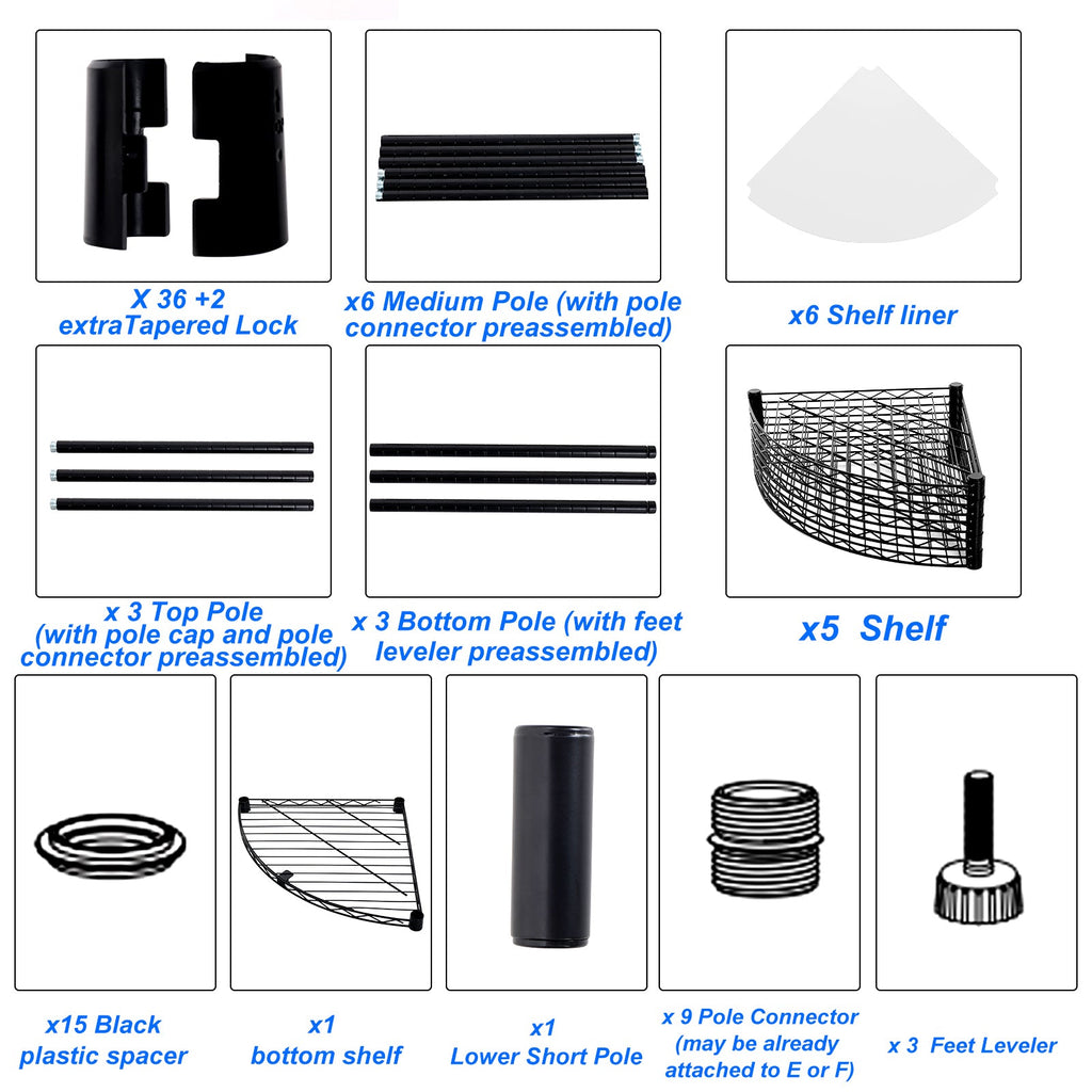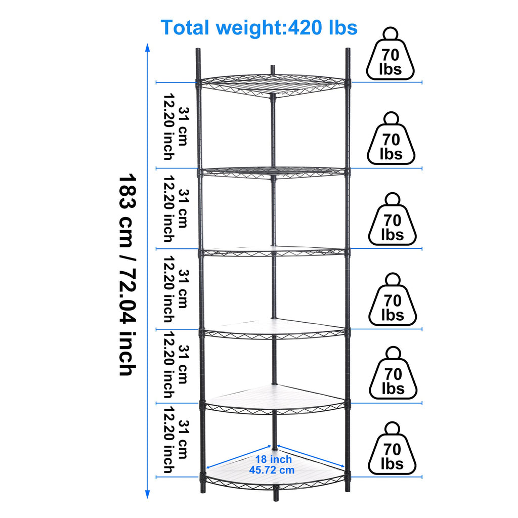 [6 TIER LARGE CAPACITY] - Heavy duty shelving with leveling feet - each layer shelf can hold 70lbs (evenly distributed), maximum load capacity is 420 lbs. It is recommend that heavy items on the bottom shelf for maximum stability. The triangle shelf has 6 shelf Liners, beautiful and fun transparent colors allow you to add a pop of color to your life. Shelf Liners is waterproof - Won't get damaged from exposure to moisture. [EXTREMELY DURABLE] - Wire shelving made of heavy steel, it has excellent rust resistance and oxidation resistance. Our wire shelf liner is crafted to provide unparalleled quality, longevity, function and beauty. Better quality thicker than the competition. The 6 tier shelf unit passed NSF certified, safe and reliable. Storage rack are perfect addition to home, office. [ADJUSTABLE DESIG] - Each shelf can adjustable in 1-inch increments, adjust the shelf height according to size of the item, meet your different needs, get the best utility shelf. Create two new shelf by splitting the top pole, you can split it according to your actual needs and achieve multiple uses. [SUTABLE FOR INSTALLATION IN THE CORNER] - Our 6-story triangular storage rack is very suitable for placing in the corner, especially for places where space is limited and requires large storage space. Simple modern design is well coordinated with any family and store decoration style. For example, bathroom, door, entrance, garage, kitchen, kitchen, laundry room, office or closet. [EASY TO ASSEMBLE] - With detailed instructions and no tools required, you can install it easily with another person within 15 minutes. There are many parts in the package, please feel free to contact us via Buyer Message if meet the case of missing parts and assembly.