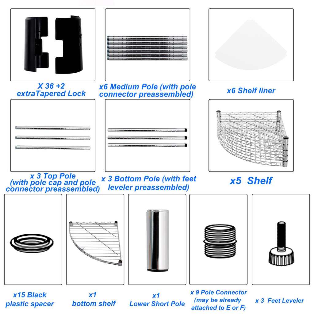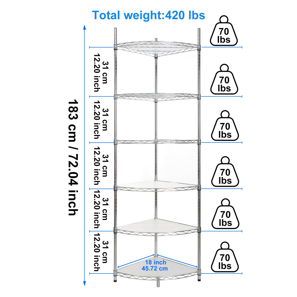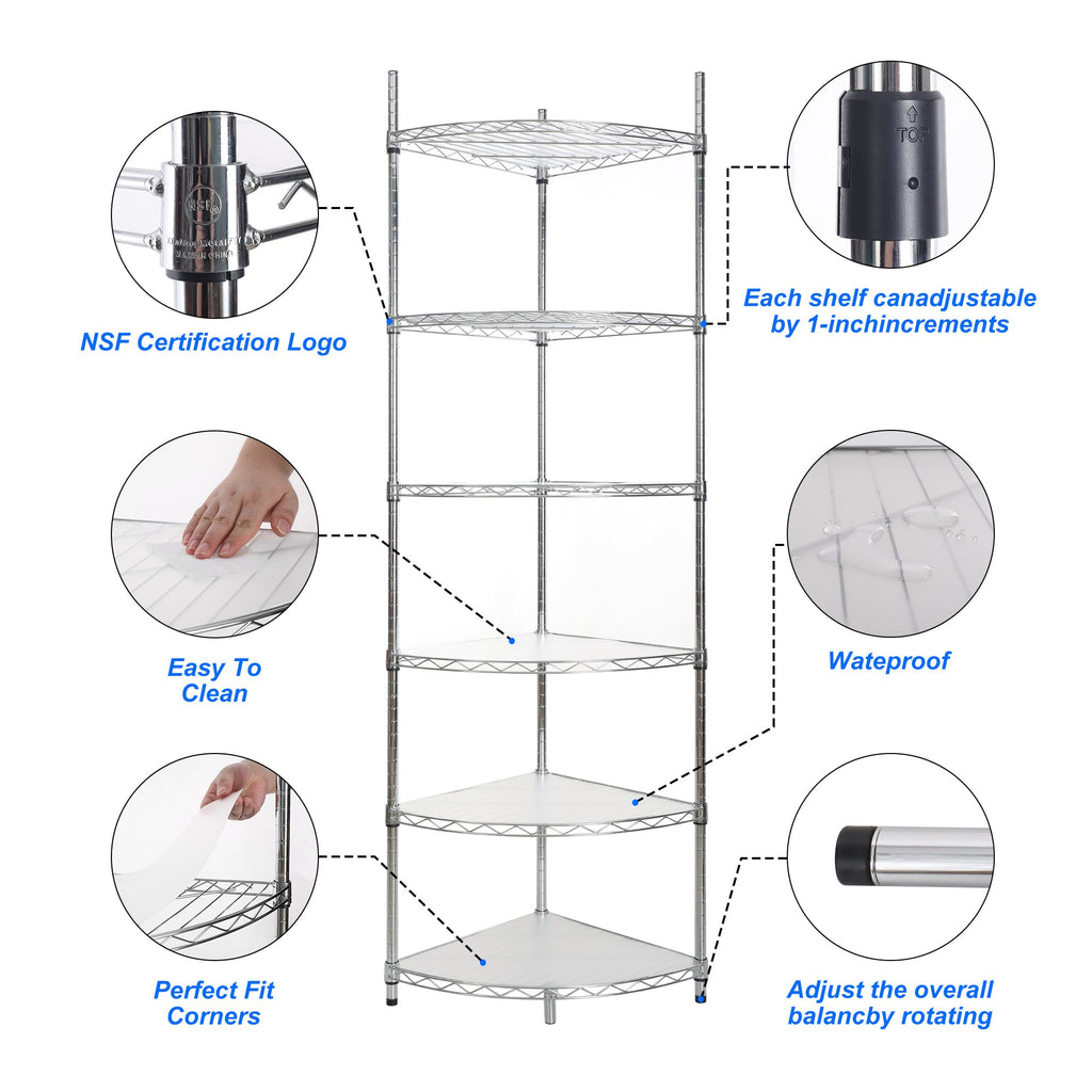 [6 TIER LARGE CAPACITY] - Heavy duty shelving with leveling feet - each layer shelf can hold 70lbs (evenly distributed), maximum load capacity is 420 lbs. It is recommend that heavy items on the bottom shelf for maximum stability. The triangle shelf has 6 shelf Liners, beautiful and fun transparent colors allow you to add a pop of color to your life. Shelf Liners is waterproof - Won't get damaged from exposure to moisture. [EXTREMELY DURABLE] - Wire shelving made of heavy steel, it has excellent rust resistance and oxidation resistance. Our wire shelf liner is crafted to provide unparalleled quality, longevity, function and beauty. Better quality thicker than the competition. The 6 tier shelf unit passed NSF certified, safe and reliable. Storage rack are perfect addition to home, office. [ADJUSTABLE DESIG] - Each shelf can adjustable in 1-inch increments, adjust the shelf height according to size of the item, meet your different needs, get the best utility shelf. Create two new shelf by splitting the top pole, you can split it according to your actual needs and achieve multiple uses. [SUTABLE FOR INSTALLATION IN THE CORNER] - Our 6-story triangular storage rack is very suitable for placing in the corner, especially for places where space is limited and requires large storage space. Simple modern design is well coordinated with any family and store decoration style. For example, bathroom, door, entrance, garage, kitchen, kitchen, laundry room, office or closet. [EASY TO ASSEMBLE] - With detailed instructions and no tools required, you can install it easily with another person within 15 minutes. There are many parts in the package, please feel free to contact us via Buyer Message if meet the case of missing parts and assembly.