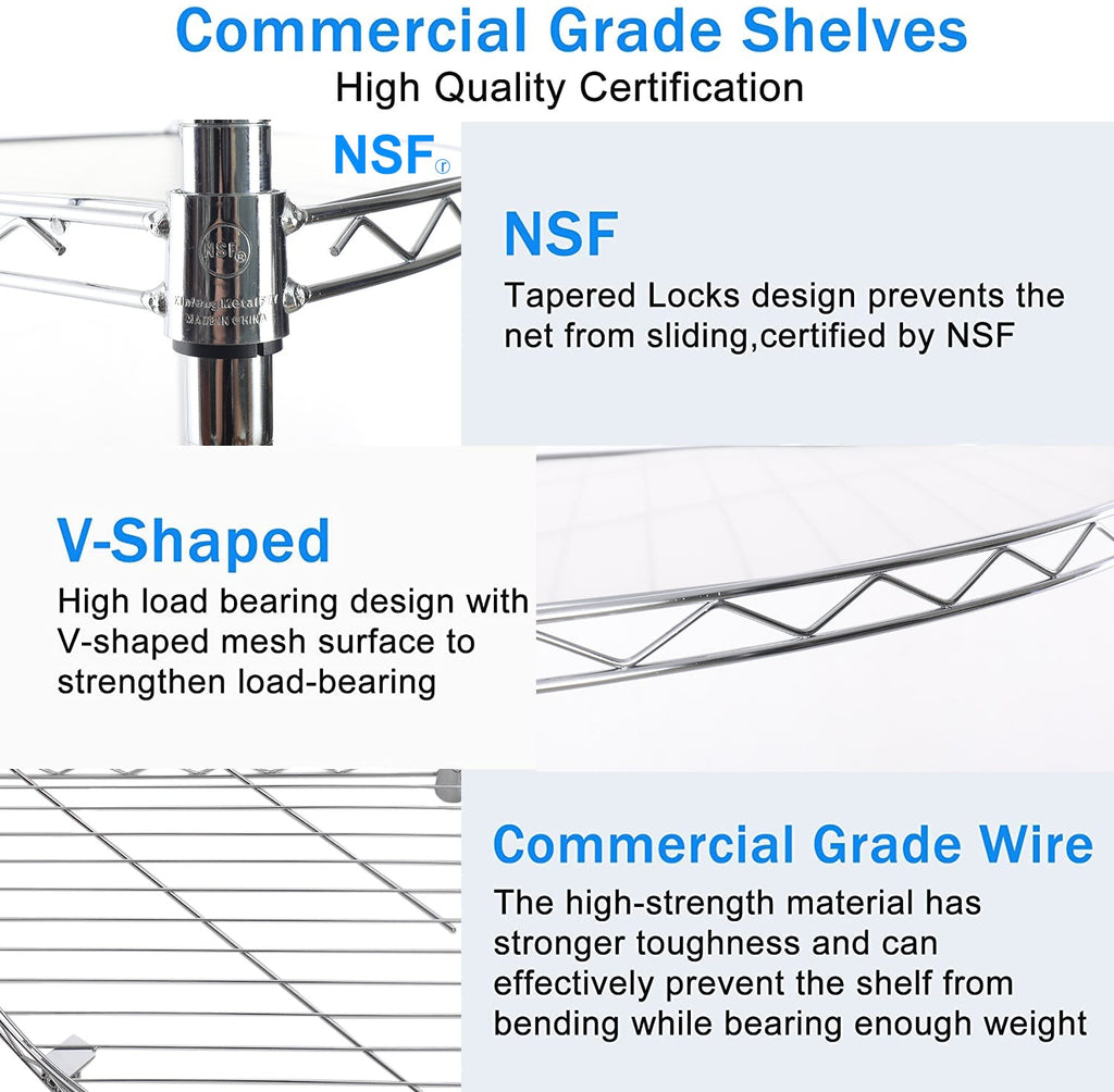 • [EXTREMELY DURABLE] - Wire shelving made of heavy steel, it has excellent rust resistance and oxidation resistance. Our wire shelf liner is crafted to provide unparalleled quality, longevity, function and beauty. Better quality thicker than the competition. The 6 tier shelf unit passed NSF certified, safe and reliable. Storage rack are perfect addition to home, office.