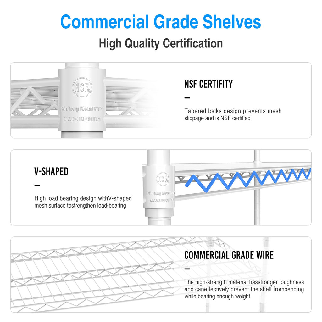 - [STURDY & EXTREMELY DURABLE] - Wire shelving made of heavy steel, it has excellent rust resistance and oxidation resistance. Our wire shelf liner is crafted to provide unparalleled quality, longevity, function and beauty. Better quality thicker than the competition. The 6 tier shelf unit passed NSF certified, safe and reliable. Storage rack are perfect addition to home, office.
