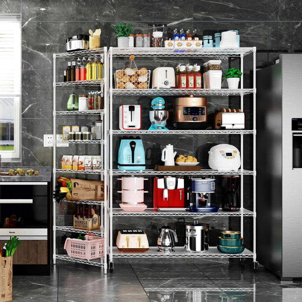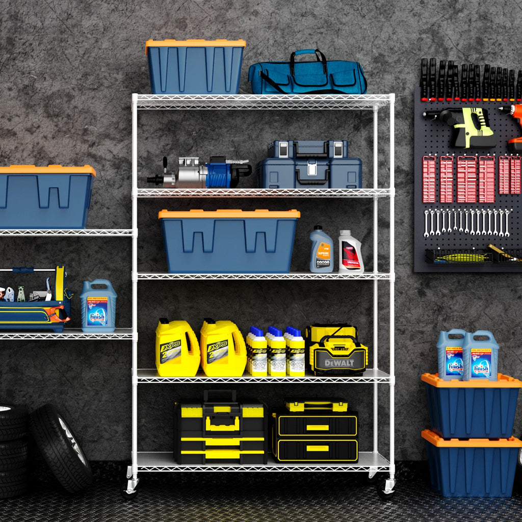 - [EASY MOVEMENT] - 6 tier garage shelves have 4 leveling feet, 4 4-inch industrial wheels(2 lockable). Wire rack on wheels can be easily positioned in supermarkets, garages, closets, kitchens, porch, pantry, etc. Height-adjustable leveling feet can be placed on uneven ground- simply twist to stabilize. Non-slip, will not scratch ground.