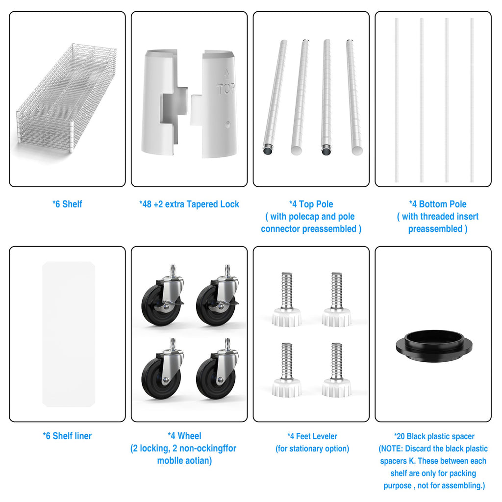 [6 TIER LARGE CAPACITY] - Heavy duty shelving with leveling feet - each layer shelf can hold 1000lbs (evenly distributed), maximum load capacity is 6000 lbs. It is recommend that heavy items on the bottom shelf for maximum stability. 6 shelf Liners choice of beautiful and fun transparent colors allow you to add a pop of color to your life. Shelf liners is waterproof - Won't get damaged from exposure to moisture. [ADJUSTABLE DESIG] - Each shelf can adjustable in 1-inch increments, adjust the shelf height according to size of the item, meet your different needs, get the best utility shelf. Create two new shelf by splitting the top pole, you can split it according to your actual needs and achieve multiple uses. [STURDY & EXTREMELY DURABLE] - Wire shelving made of heavy steel, it has excellent rust resistance and oxidation resistance. Our wire shelf liner is crafted to provide unparalleled quality, longevity, function and beauty. Better quality thicker than the competition. The 6 tier shelf unit passed NSF certified, safe and reliable. Storage rack are perfect addition to home, office. [EASY MOVEMENT] - 6 tier garage shelves have 4 leveling feet, 4 4-inch industrial wheels(2 lockable). Wire rack on wheels can be easily positioned in supermarkets, garages, closets, kitchens, porch, pantry, etc. Height-adjustable leveling feet can be placed on uneven ground- simply twist to stabilize. Non-slip, will not scratch ground. [EASY TO ASSEMBLE] - With detailed instructions and no tools required, you can install it easily with another person within 15 minutes. There are many parts in the package, please feel free to contact us via buyer message if meet the case of missing parts and assembly.