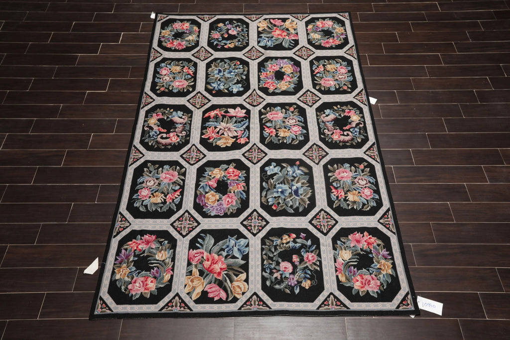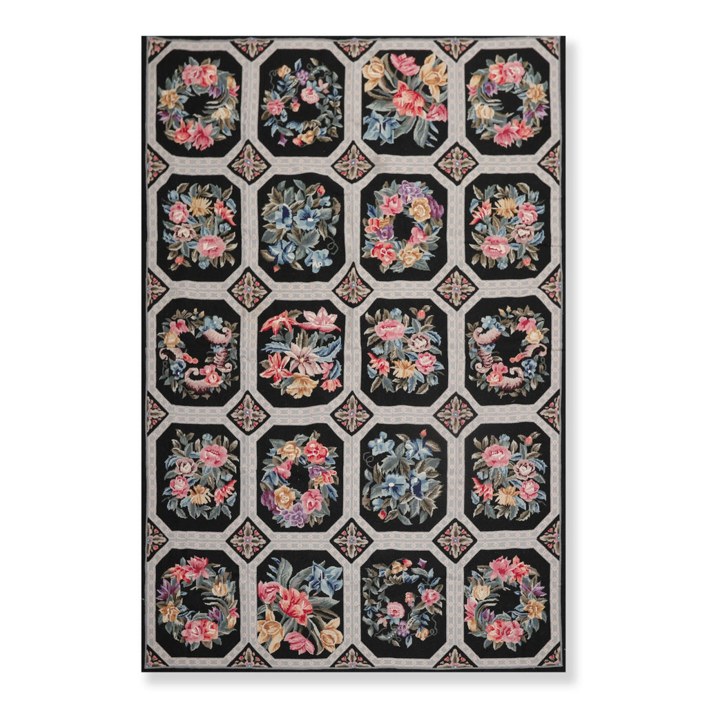 This is a beautiful Black, Blue, Grey, Rose, Purple, Gold, Brown, Multi Color Hand Woven French Aubusson Needlepoint Area Rug Wool Rug. Its elegant style is easy to decorate with and perfect for living room, dining room, bed room or anywhere in the residence or office. This Aubusson is 100% wool in thin pile. Rugs and tapestries were made famous during 14th and 15th century and were made in Aubusson, a small medieval town in France. The rugs have motifs in traditional design. During 1930s tapestry was made popular by artists such as Cocteau, Dufy, Dali, Braque, Calder and Picasso who were invited to Aubusson to express themselves through the medium of wool.