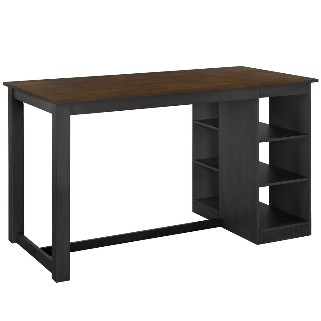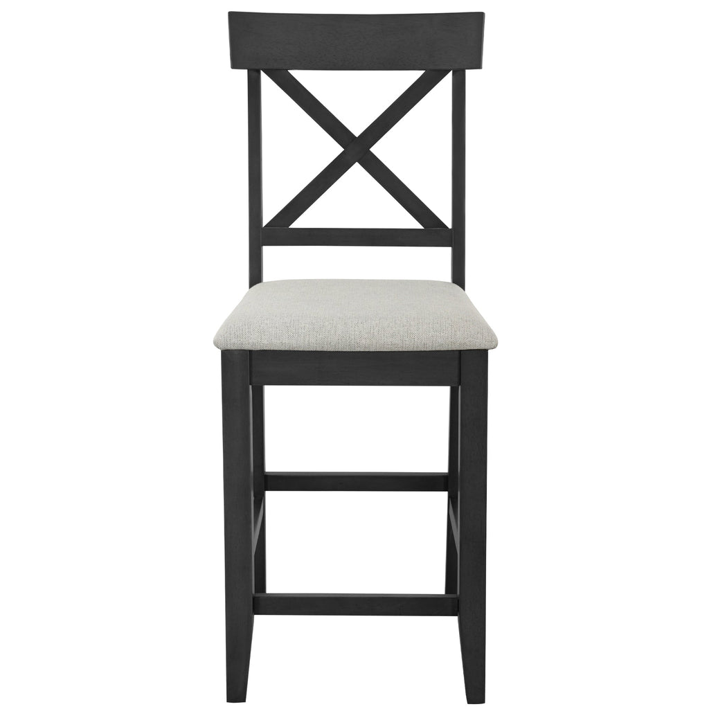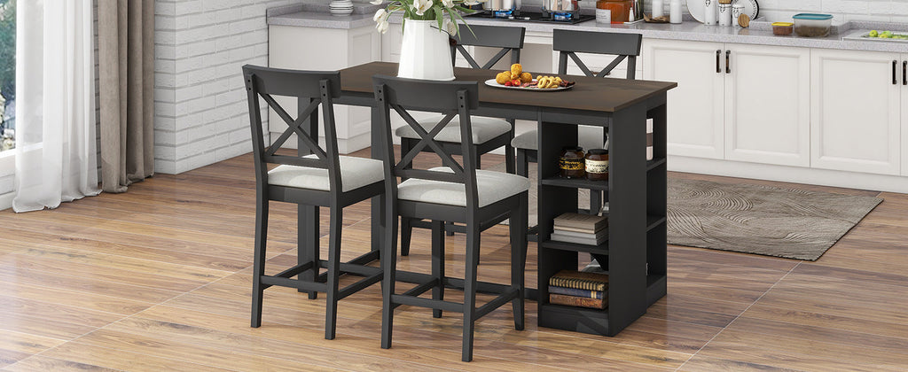 | Highlights | Farmhouse Style // Solid Wood // Counter Height // 2-Tone Design // Half-Open Side Storage Shelves // 3 Tiers // Long Stretcher under Top // Cross Back Dining Chair // Padded Cushions // Footrests // Dining Set for 4 // 2 Colors Available |