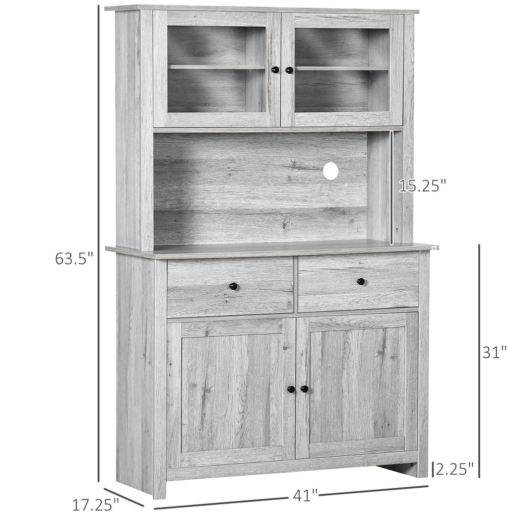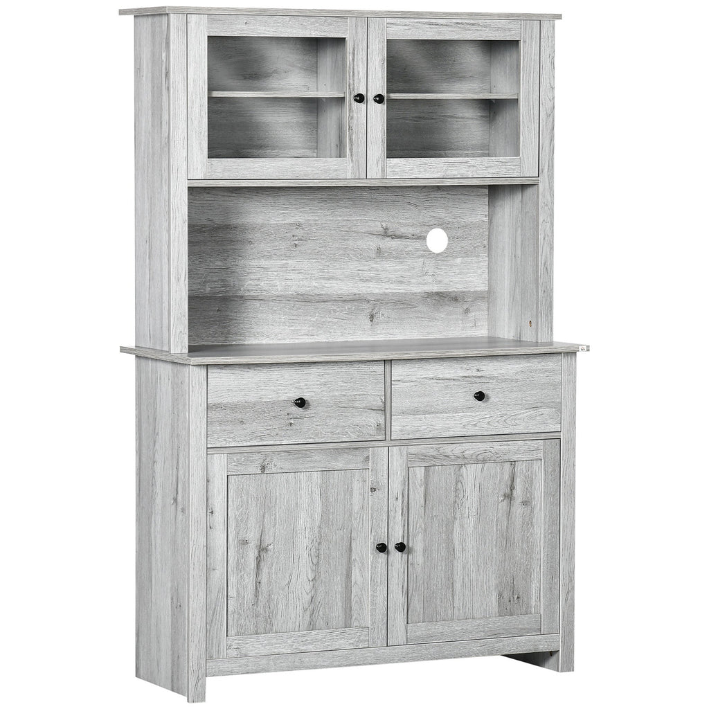 - Upgrade Your Storage: The multilayer shelves of this kitchen hutch give you plenty of room for dishes, cookbooks, pots and pans, dry goods while the two drawers allow you to put away napkins, towels, and silverware. The open middle space can hold kitchen appliances such as a microwave or coffee maker. If you have taller items, adjustable shelves can be customized to fit things like pitchers, pasta containers, and blenders. Cable management cleans your desk space and maintains a safe counter.