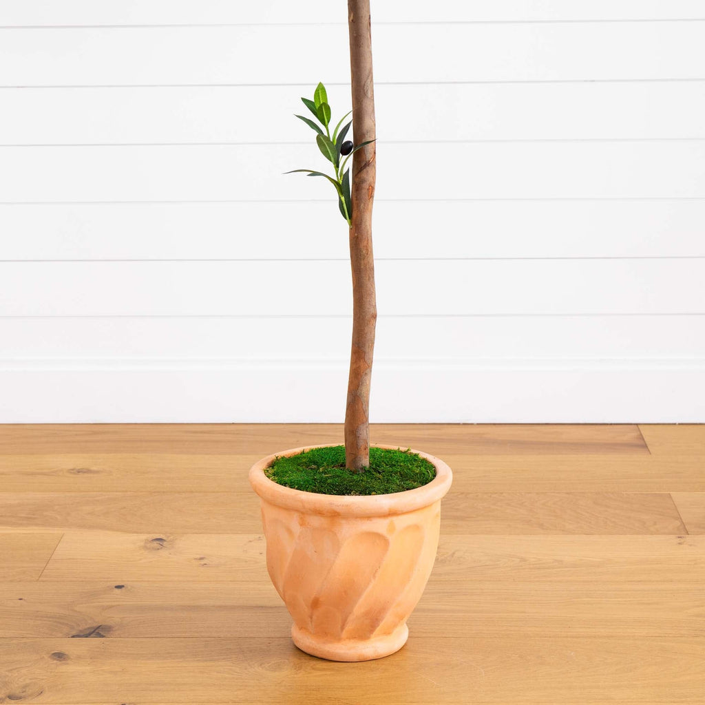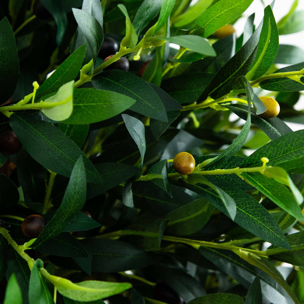 Numerous outdoor-safe green leaves are arranged to extend upward with this 63” artificial olive topiary tree. The tree’s stem bends in a realistic way and stands within a bed of green moss. To complete the look, it comes in a terra cotta planter, giving it a natural feel that is perfect for the outdoors. Use it to enhance your backyard landscape by placing it near a flower bed as a complementary piece.