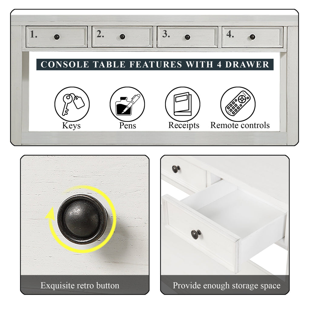 This console table is equipped with a 63-inch long table top to meet your various placement needs. The retro design of the overall table makes your living room unique. All 4 drawers are equipped with retro handles, providing ideal storage for your daily necessities and saving space in your living room. Spacious shelves provide a satisfying area for your larger items such as books, storage box, and baskets. Solid pine and high-quality MDF material ensure this table will last you a long time.