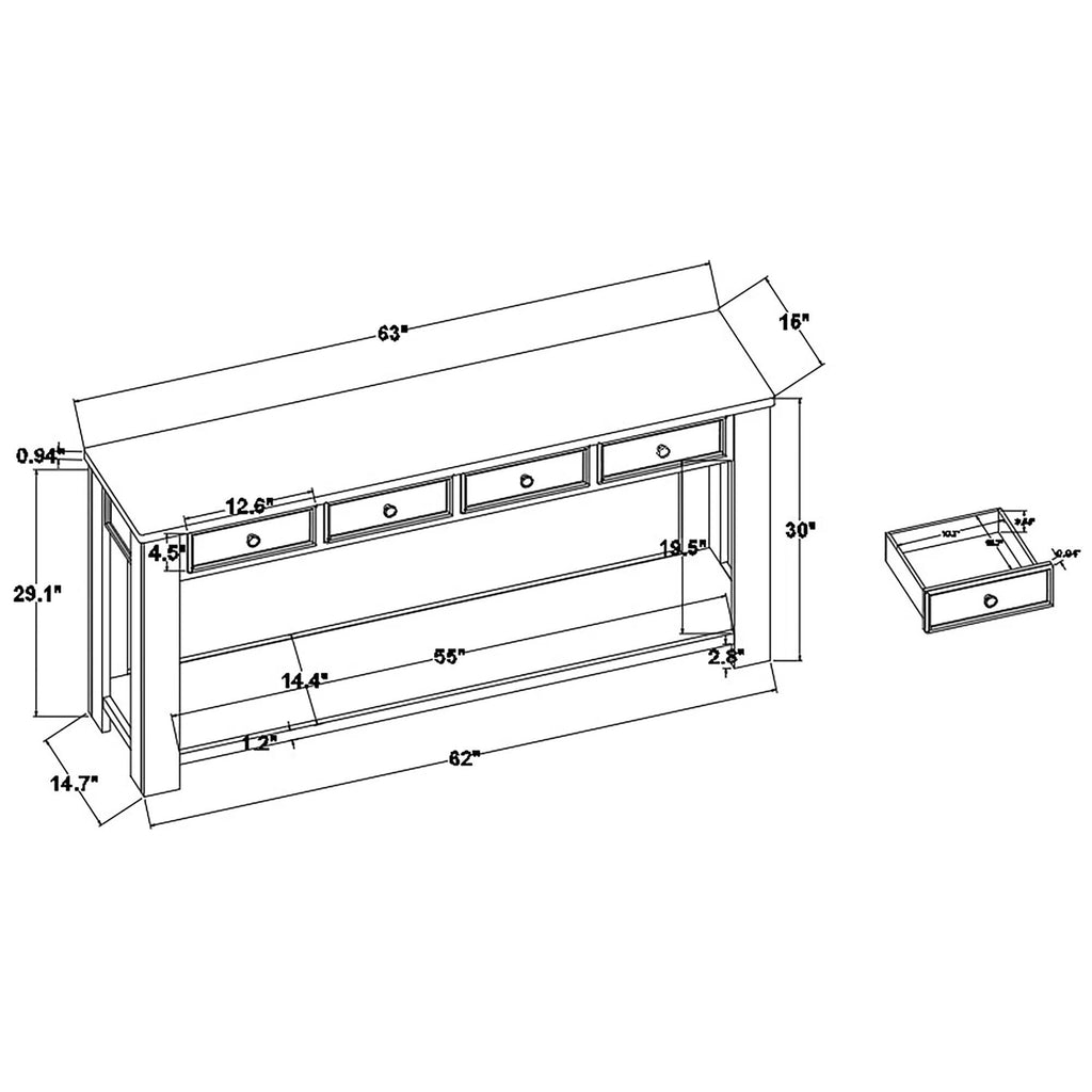 【LARGE STORAGE SPACE】: 63''L x 15''W x 30''H. Weight -52.95lbs. Top weight capacity - 100lbs, shelf weight capacity - 40lbs, each drawer - 18lbs. The sofa table features with total 4 functional drawers and a fixed lower shelf and long enough tabletop which provide enough storage space.