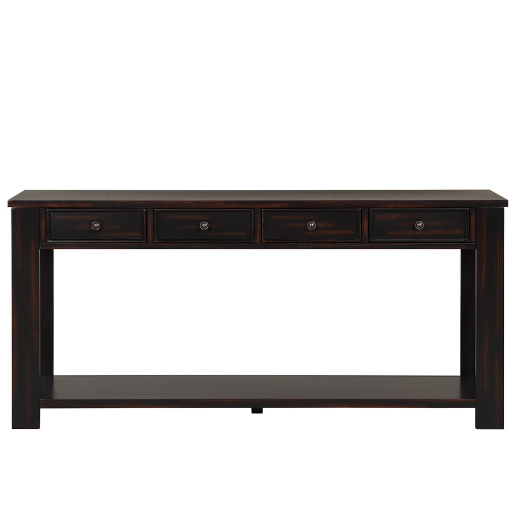This console table is equipped with a 63-inch long table top to meet your various placement needs. The retro design of the whole table makes your living room unique. The overall presentation is black with dark gold, which is made by manual labor. All 4 drawers are equipped with retro round handles, providing ideal storage for your daily necessities and saving space in your living room. Spacious shelves provide a satisfying area for your larger items such as books, storage box, and baskets. Solid pine and high-quality MDF material ensure this table will last you a long time.