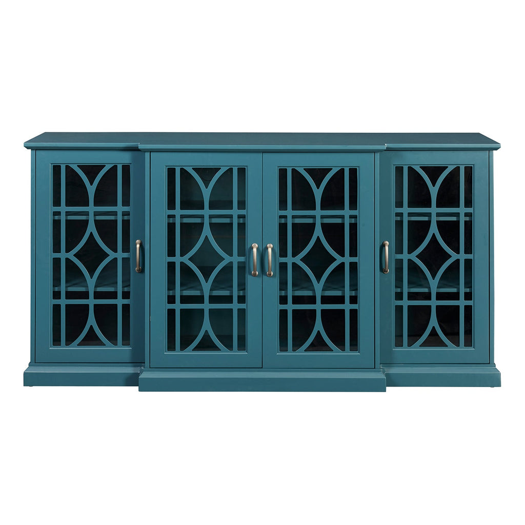 This Multifunctional Storage Buffet TV Cabinet made of high quality MDF wood board with spraying coated in teal blue finish. This cabinet comes with 4 visual tempered clear glass to keep your things out of the dust and easy to identify and reach. The decorative carved wood geometric overlay on cabinet doors adds beauty and enhances the artistic sense of the entire home. No worry about the stability and safety problem, this buffet cabinet is equipped with anti-tip to avoid falling down. Ample desktop and 3 closed cabinets with adjustable shelves provide you with large storage space to keep your kitchen, dining room, living room and other scenarios organized and clean. You can also customize your own storage space by removing or adjusting the movable partition. It is a good piece of furniture combined beauty with practicality.