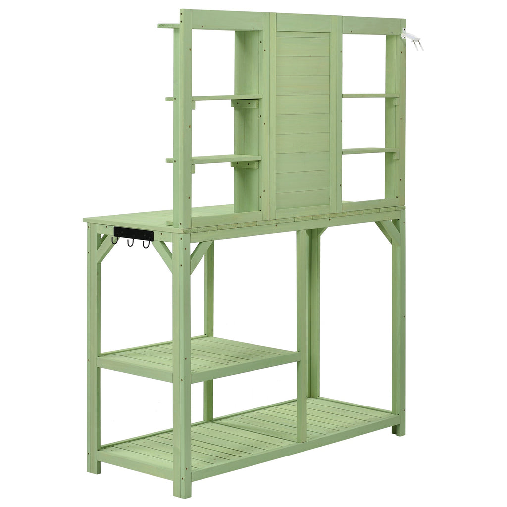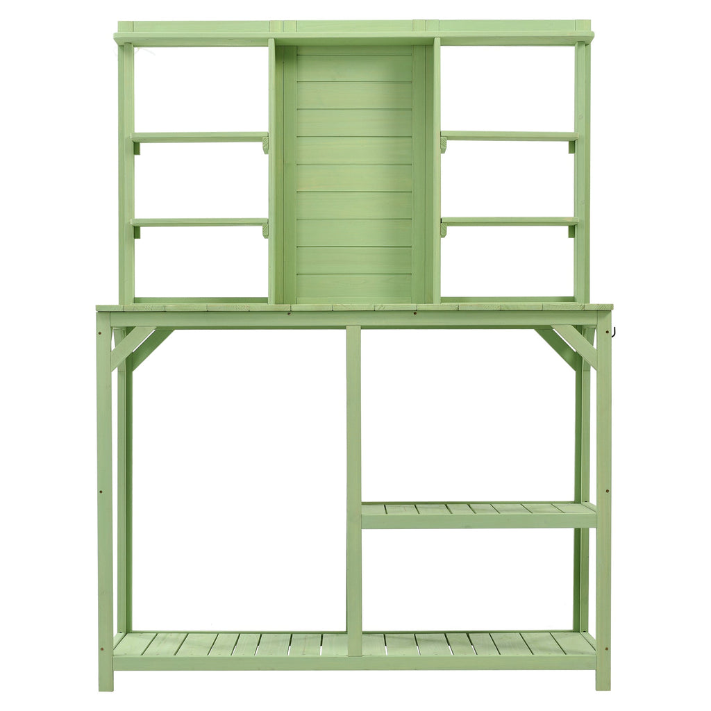 - [Spacious Shelves] 2 symmetrical 3-tier upper shelves, 1 top shelf and 2 lower shelves. This well-designed potting bench has plenty of storage areas. Open shelving will help to keep tools in handy and store not only small tools but also extra soil, pots and other gardening supplies. Notice: The lower half shelf can be in both left or right up to your convenience.