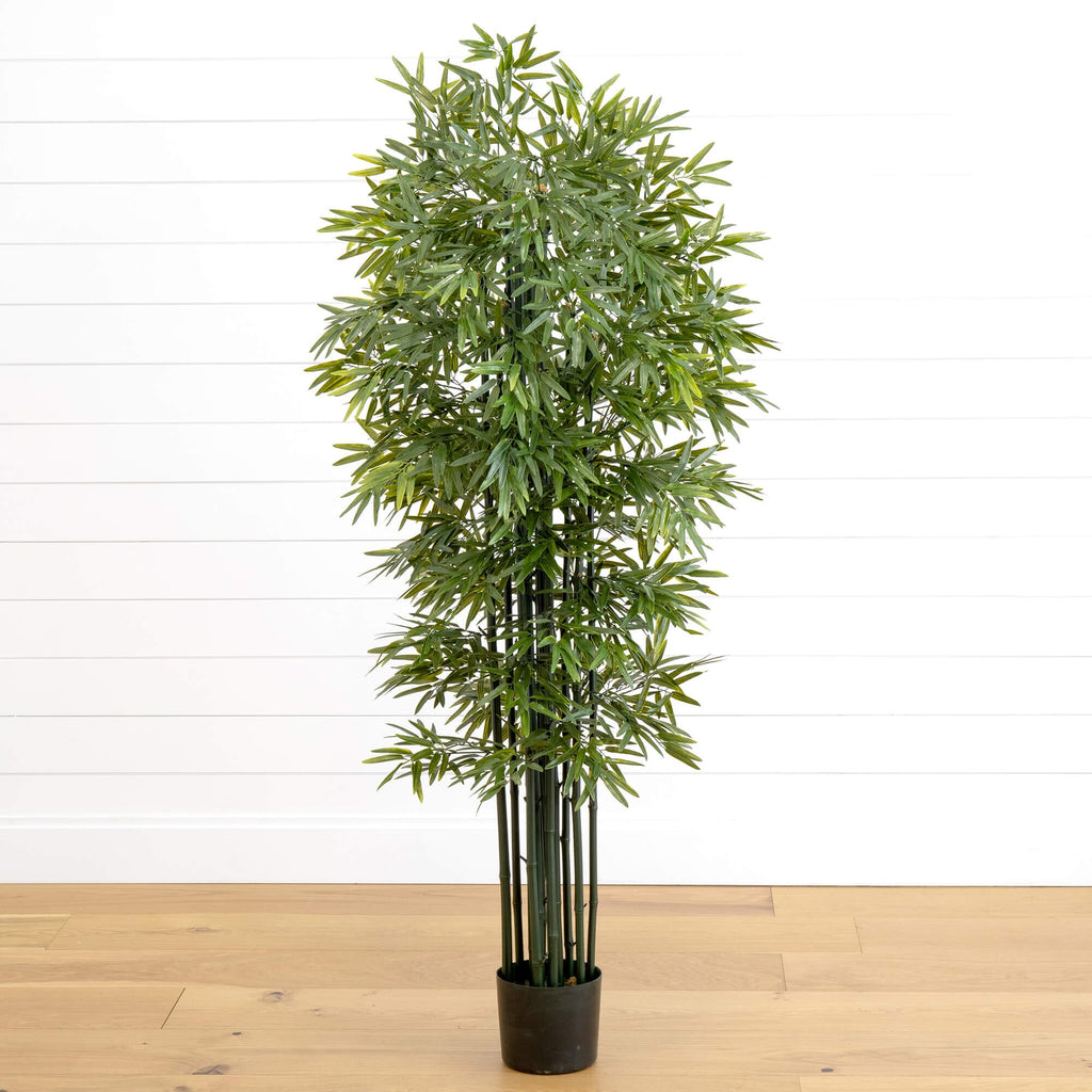 Sprouting from tall, staff-life stalks, the jade green canopy of leaves of this artificial bamboo tree are the perfect punctuation of decor both inside and outside your home. Place this tree in the corners of your room to create an inviting periphery or place them in a row on the edge of your patio to provide a natural touch of privacy.