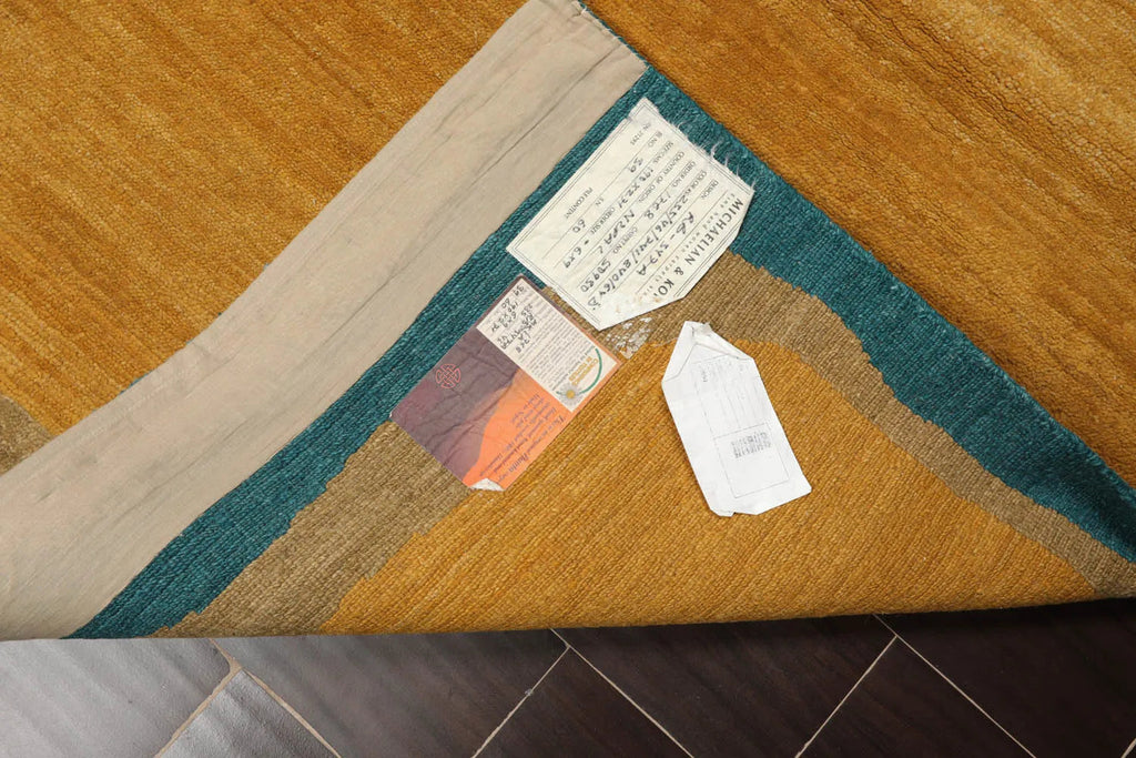 This is a beautiful Gold, Coral, Purple Color Michaelian & Kohlberg design Hand Knotted, Tibetan Oriental 100% Wool Rug.