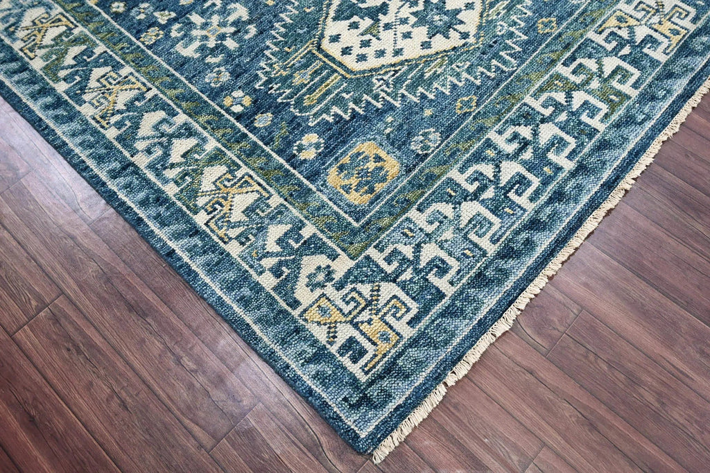 Before you is a beautiful Blue, Ivory, Green. Light Gold Color Hand Knotted LoomBloom Arts & Crafts Turkish Oushak 100% Wool Rug from India. This Oushak rug with its large and oversized print designs represents the Arts & Crafts genre of rug designs. It has co-opted and reinterpreted the traditional Oushak rug from Turkey to suit modern decor needs. Its trendy color combination elevates the color palette from mundane to intense and glamorous. The design scheme of the rug is versatile to suit all styles of decor aesthetics.