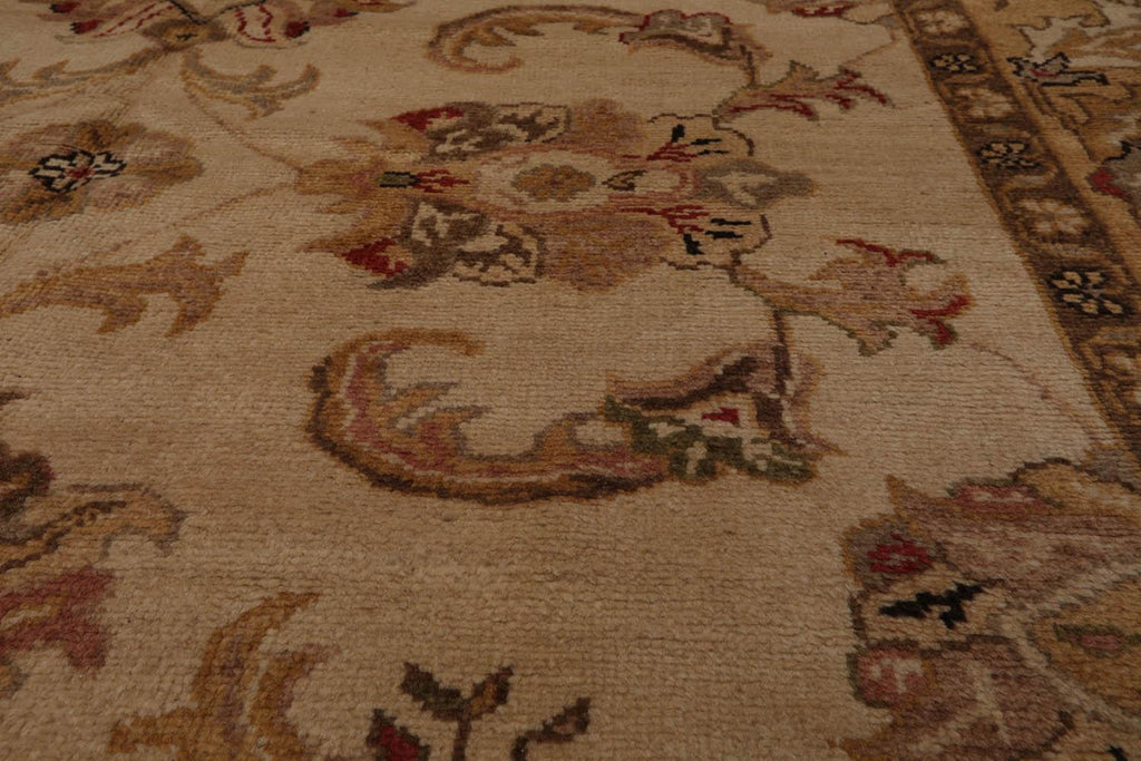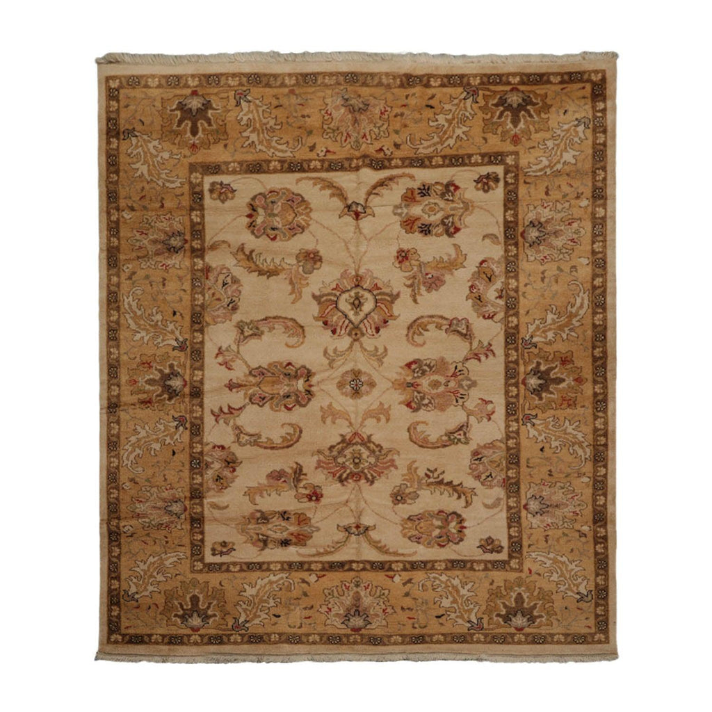 Cosmopolitan and sophisticated in look, the rug has been hand crafted by artisans to a flawless composition. The main field comprising highly stylized floral and botanical elements is encompassed by a handsome multi-band border. The design of the border compliments the inner field and adds gentle grandeur to the artful composition of the rug. This rug representing an illustrious legacy of exquisite artistry and intricate craftsmanship is primed to add visual glamor and class to its surroundings. Its soft texture and timeless design make it ideal to enhance any space where it is placed.