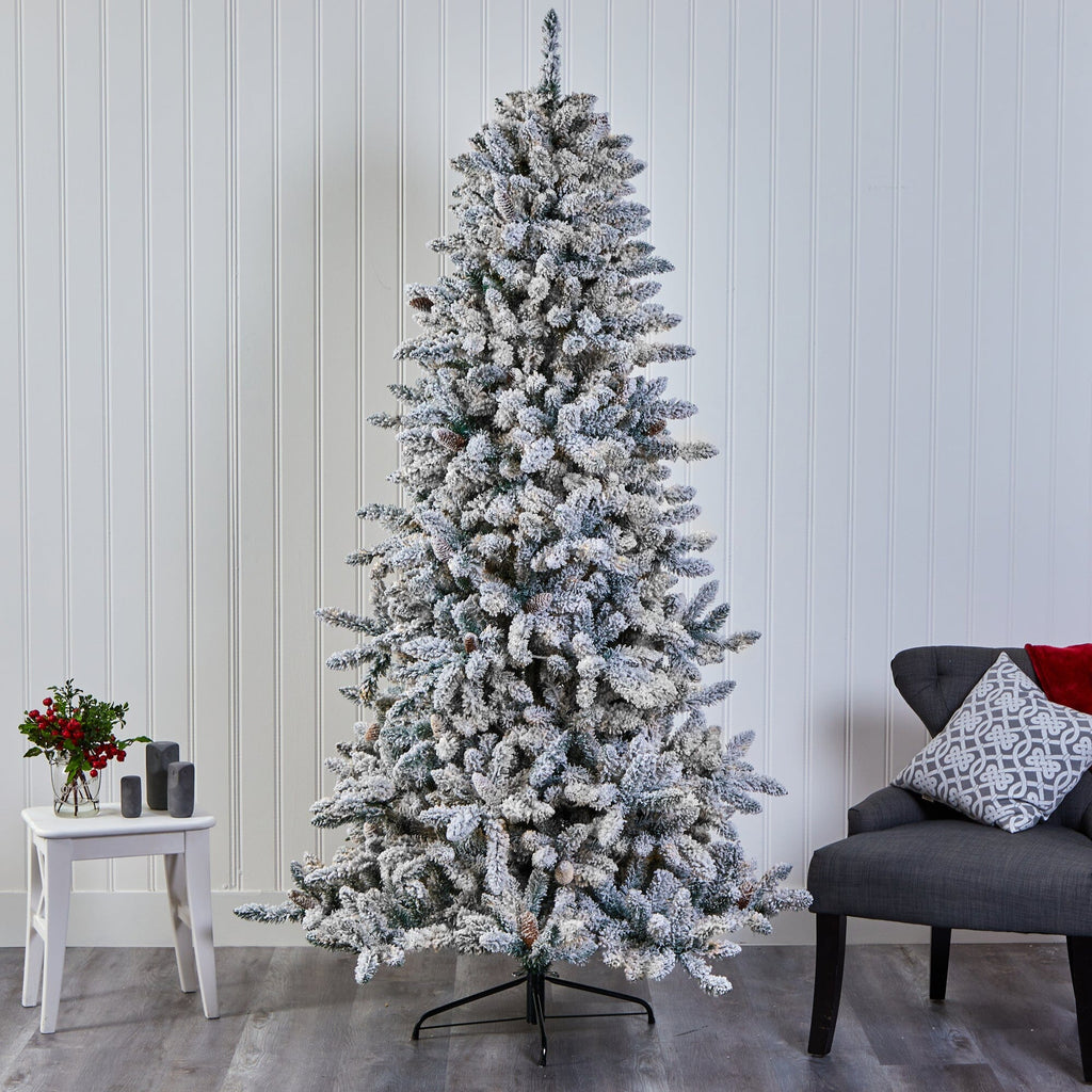 Create a true Christmas scene in your home or office with the help of this flocked artificial Christmas tree! Completely maintenance-free, this winter-inspired fake Christmas tree boasts an array of soft looking foliage (1336 tips to accent with your holiday ornaments!), all beautifully flocked in soft evergreens and handsomely accented throughout with faux pinecones, stabilized on a metal stand, this impressive 7.5’ tall Christmas tree will not only make holiday decorating a breeze but ensure your home is always looking picture-perfect throughout the holiday season.