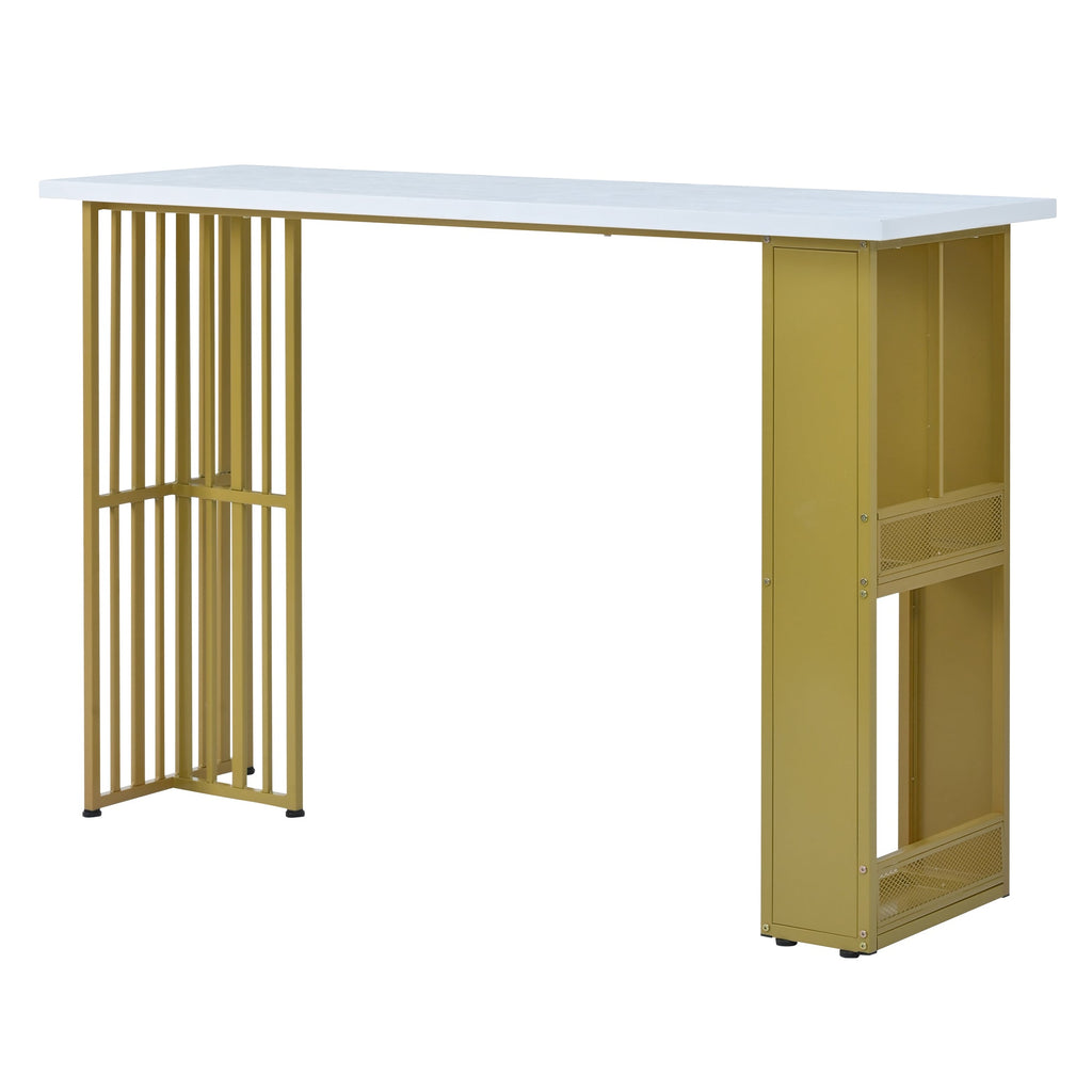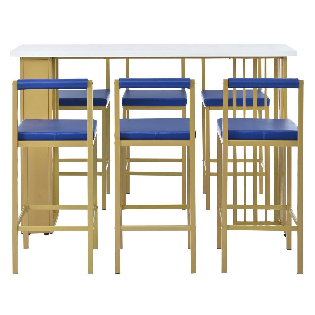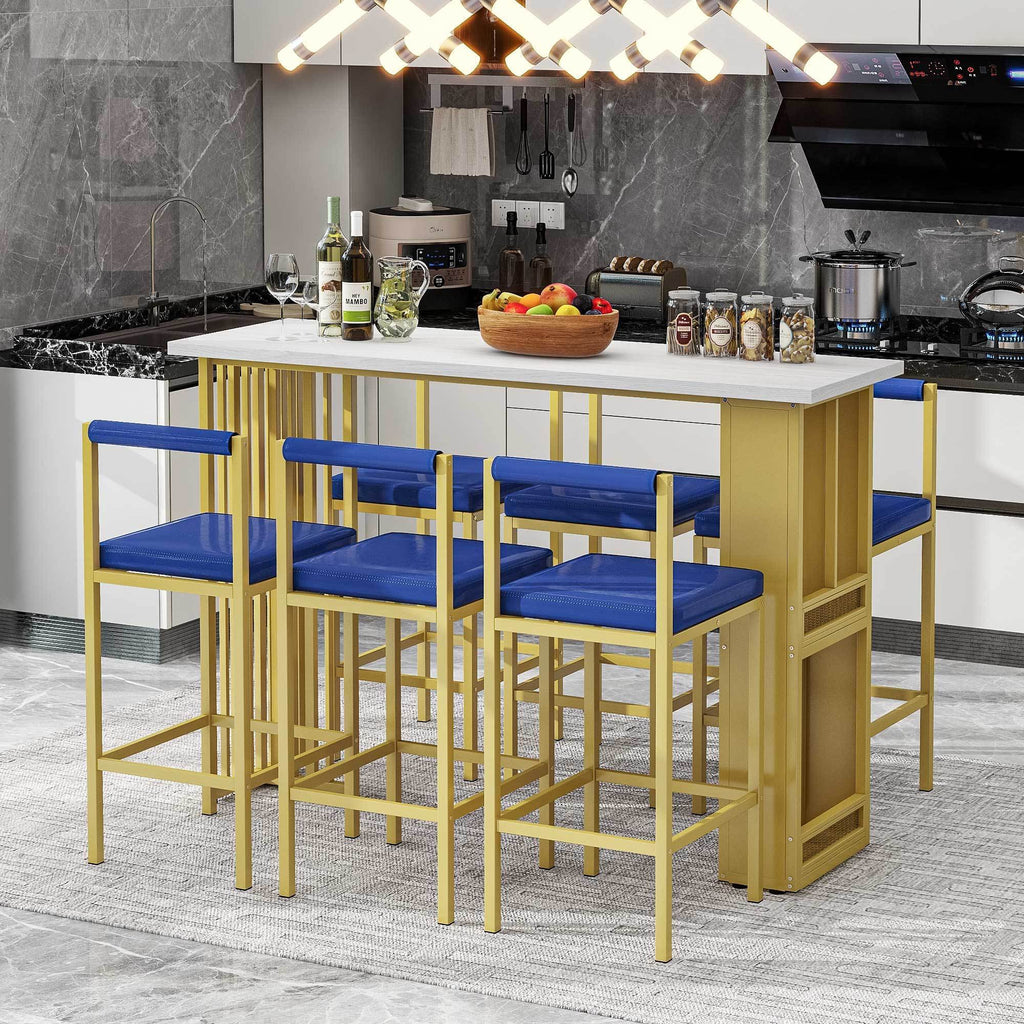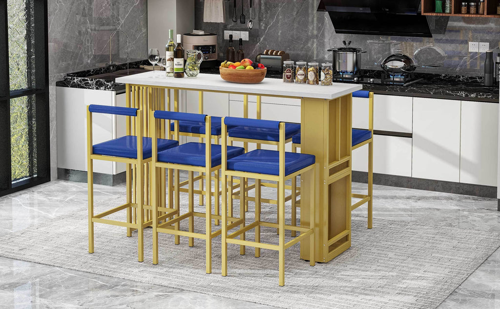 This modern counter height dining bar table set consists of 1 bar table and 6 bar stools, which can comfortably seat 6 people. Among them, the white rectangular table top is clean and bright, and the golden metal legs are full of luxury. The simple lines and tall height make this bar table set suitable for many places. The beautiful appearance and simple design make it an effortless perfect addition to bars, cafes, restaurants or casual spaces.