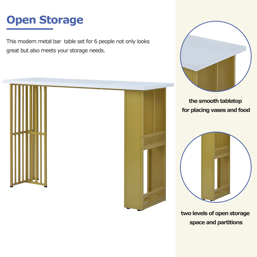 - Modern Style: This modern counter height dining bar table set consists of 1 bar table and 6 bar stools, which can comfortably seat 6 people. Among them, the white rectangular table top is clean and bright, and the golden metal legs are full of luxury. The simple lines and tall height make this bar table set suitable for many places. The beautiful appearance and simple design make it an effortless perfect addition to bars, cafes, restaurants or casual spaces.