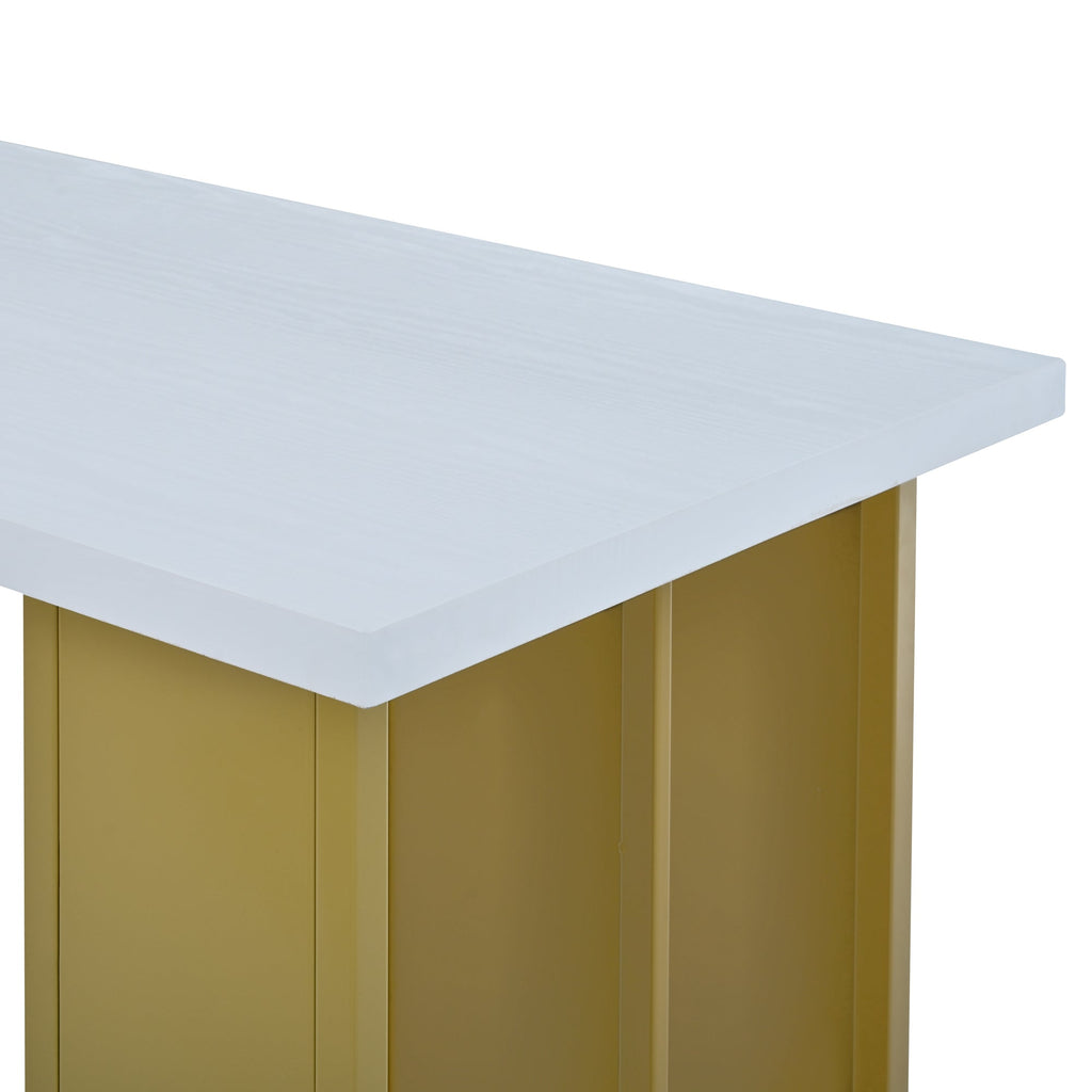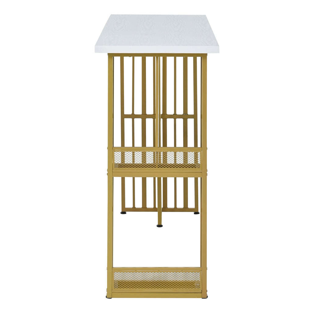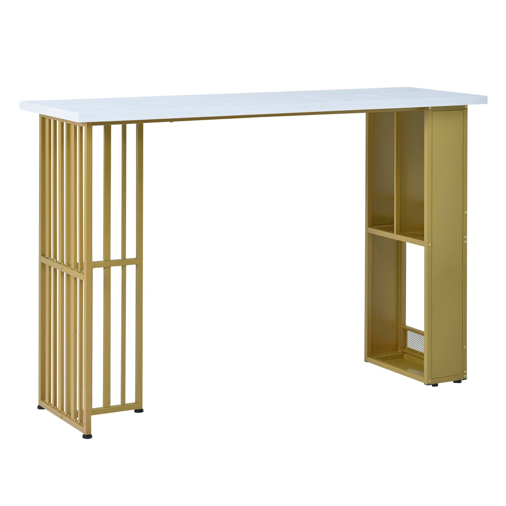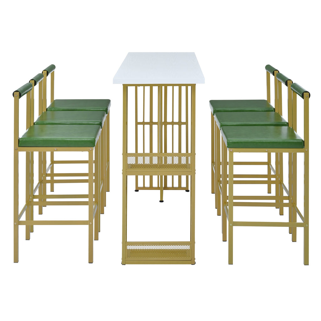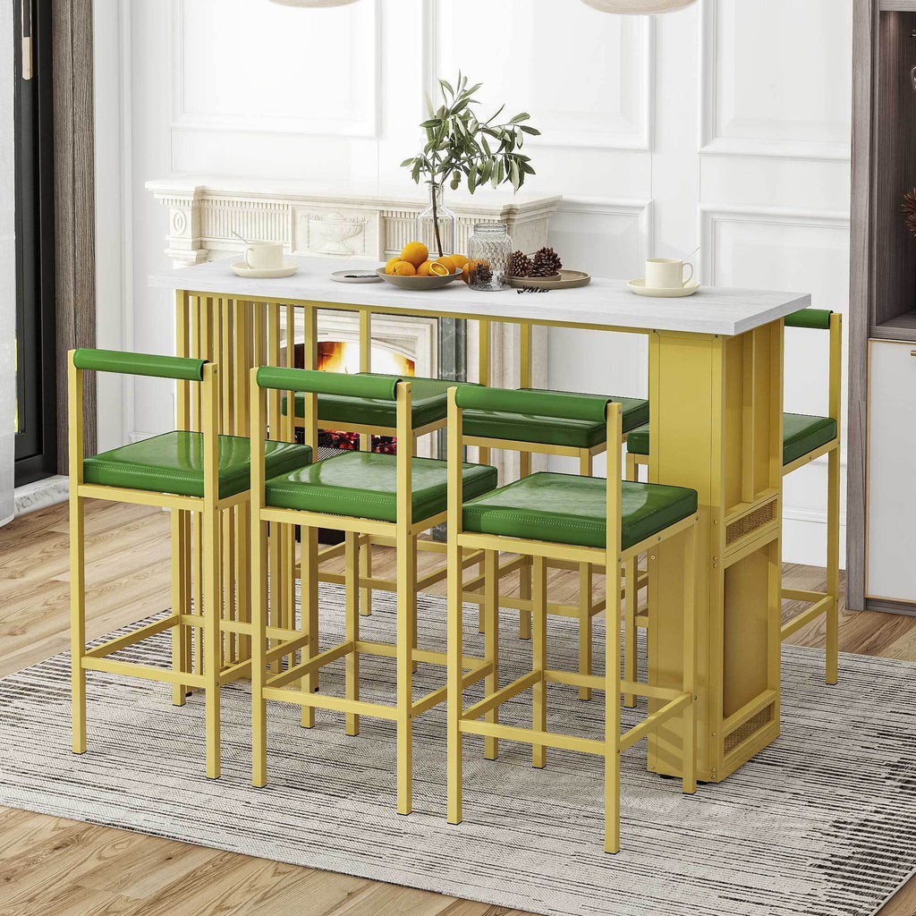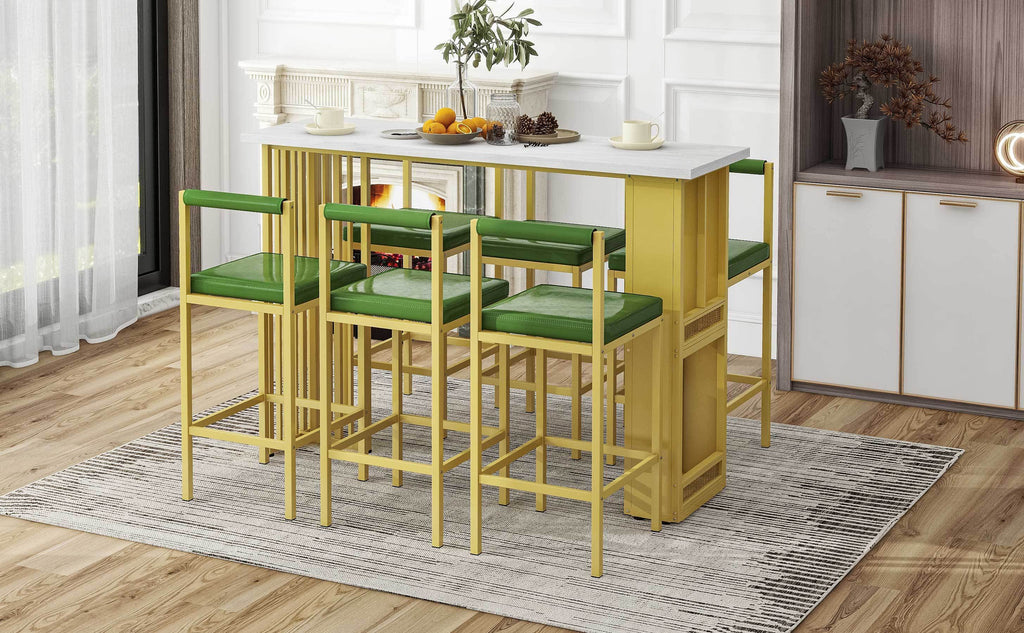 This modern counter height dining bar table set consists of 1 bar table and 6 bar stools, which can comfortably seat 6 people. Among them, the white rectangular table top is clean and bright, and the golden metal legs are full of luxury. The simple lines and tall height make this bar table set suitable for many places. The beautiful appearance and simple design make it an effortless perfect addition to bars, cafes, restaurants or casual spaces.