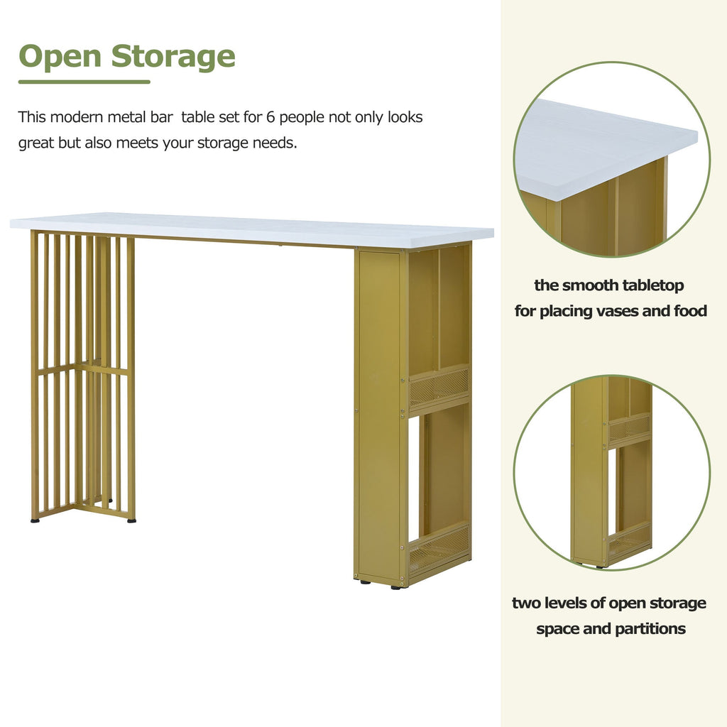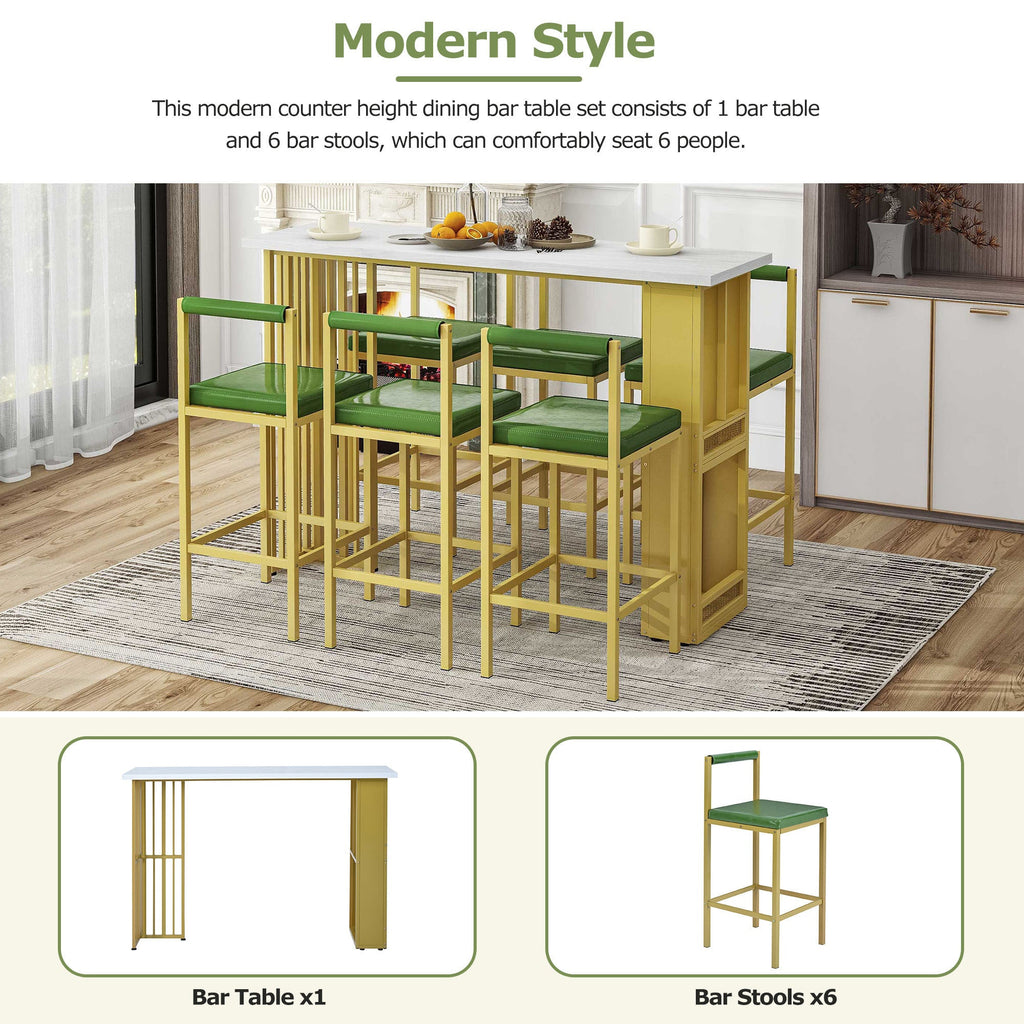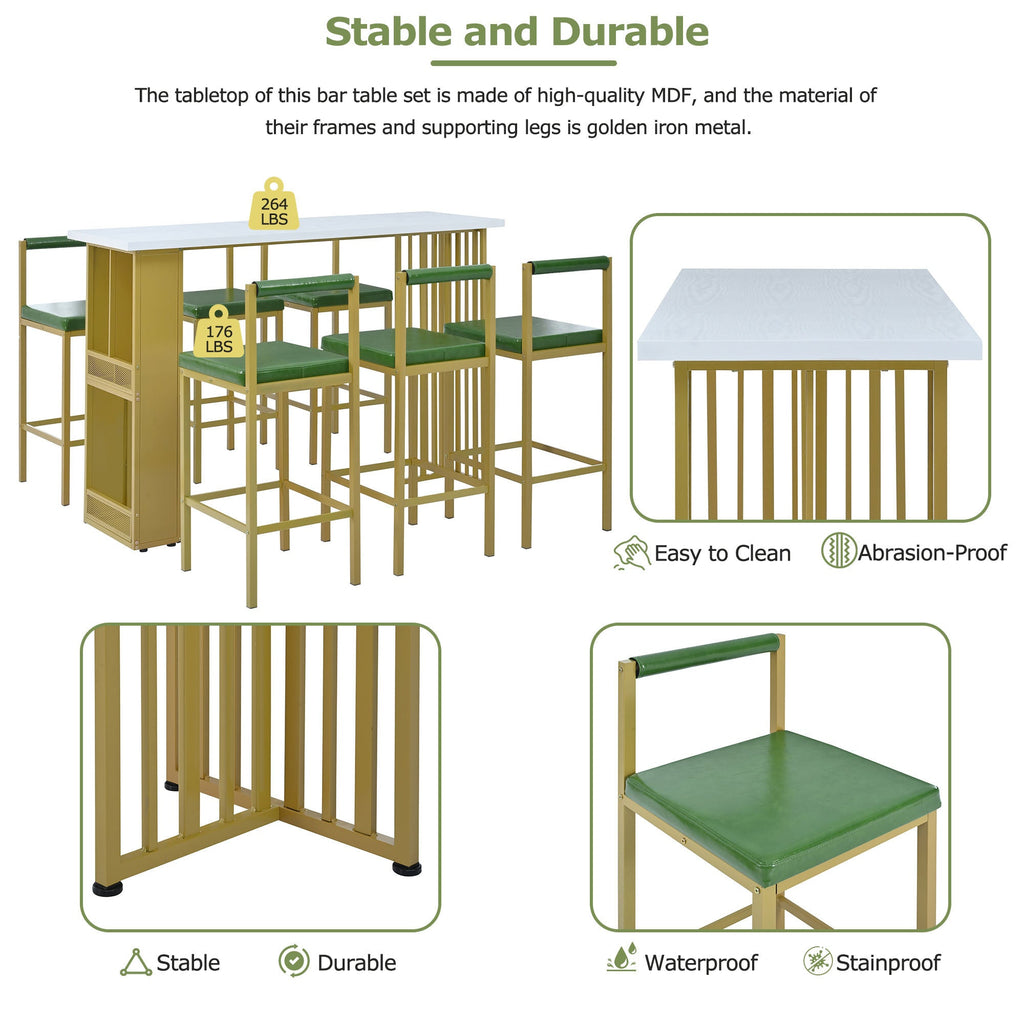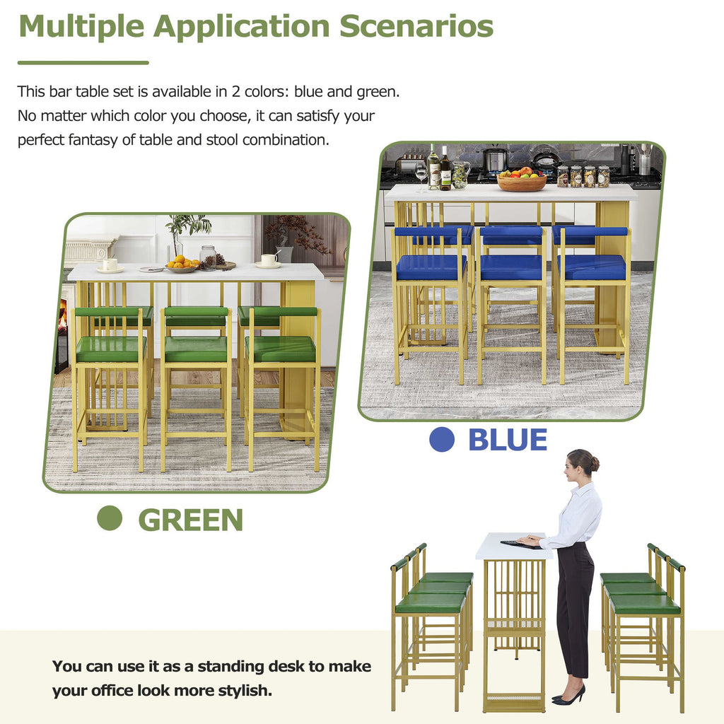 - Modern Style: This modern counter height dining bar table set consists of 1 bar table and 6 bar stools, which can comfortably seat 6 people. Among them, the white rectangular table top is clean and bright, and the golden metal legs are full of luxury. The simple lines and tall height make this bar table set suitable for many places. The beautiful appearance and simple design make it an effortless perfect addition to bars, cafes, restaurants or casual spaces.