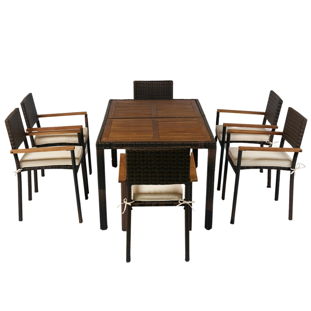 7 piece Outdoor Patio Wicker Dining Set Patio Wicker Furniture Dining Set w/Acacia Wood Top Brown Wicker + Cream Cushion