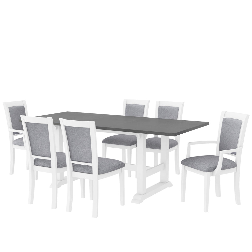 | Highlights | Solid Wood //Smooth Wood Texture// Extendable Tabletop // Removable Leaf // Thick Tabletop // Trestle Base w/ Stretcher // Decorative&Supportive Block // 4 Side Chairs // 2 Arm Chairs // Ergonomic Back // Upholstered Chairs // Set of 6 Chairs |