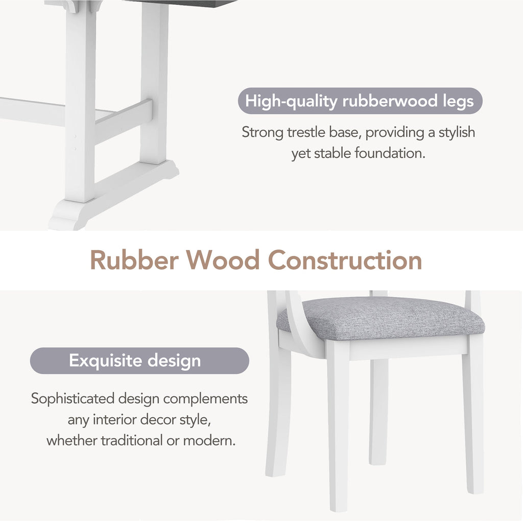 - [Rubber Wood Construction] This wood dining table set is built to last with high-quality rubberwood legs and a strong trestle base, providing a stylish yet stable foundation. Additionally, the long stretcher enhances the table's sturdiness, ensuring it will remain a fixture in your home for years to come. The chairs feature durable rubberwood frames, and their clean, sophisticated design complements any interior decor style, whether traditional or modern.