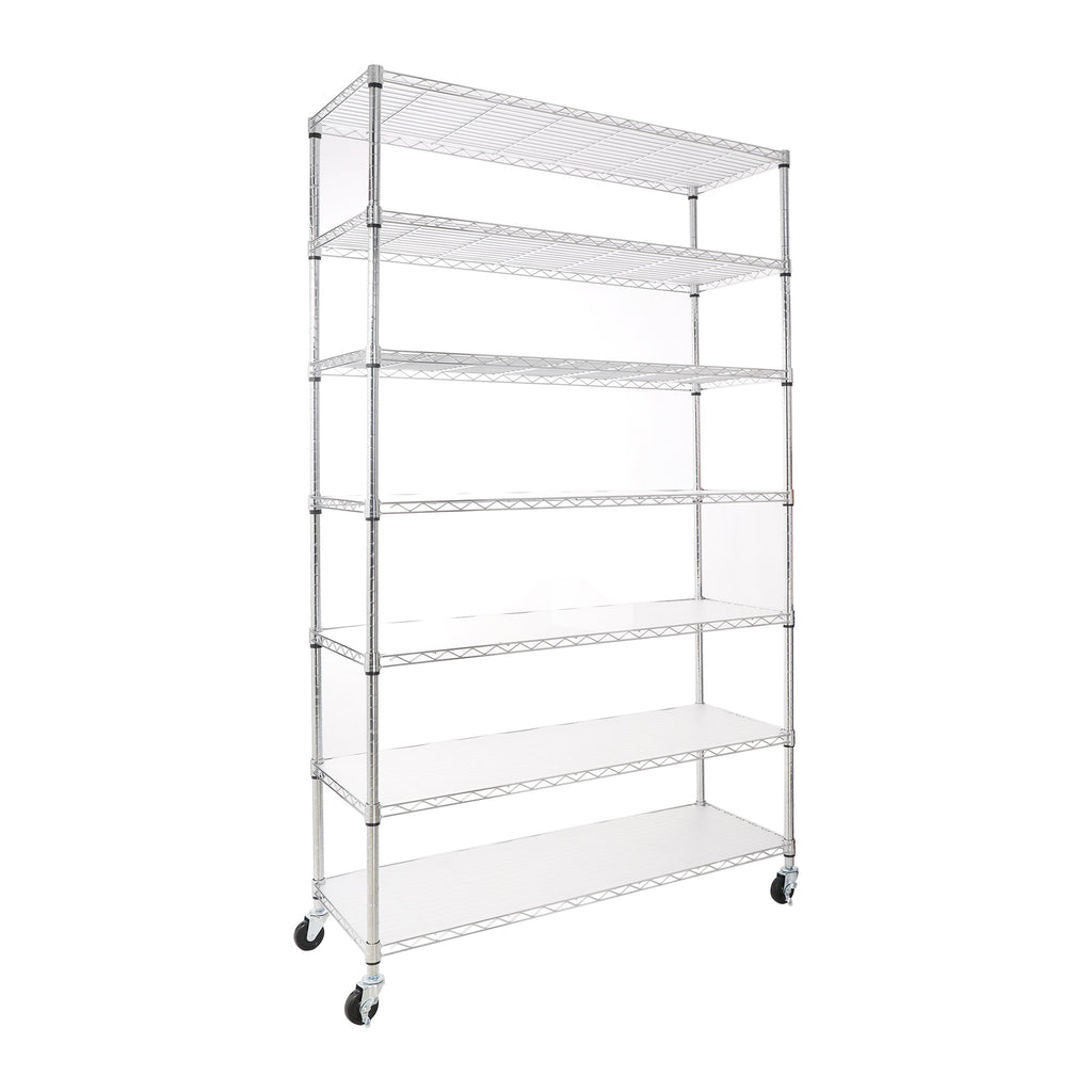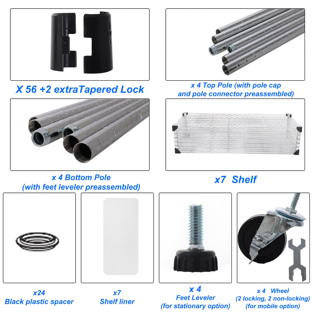 [7 TIER LARGE CAPACITY] - Heavy duty shelving with leveling feet - each layer shelf can hold 350lbs (evenly distributed), maximum load capacity is 2450 lbs. It is recommend that heavy items on the bottom shelf for maximum stability. 7 shelf Liners choice of beautiful and fun transparent colors allow you to add a pop of color to your life. Shelf Liners is waterproof - Won't get damaged from exposure to moisture. [ADJUSTABLE DESIG] - Each shelf can adjustable in 1-inch increments, adjust the shelf height according to size of the item, meet your different needs, get the best utility shelf. Create two new shelf by splitting the top pole, you can split it according to your actual needs and achieve multiple uses. [EXTREMELY DURABLE] - Wire shelving made of heavy steel, it has excellent rust resistance and oxidation resistance. Our wire shelf liner is crafted to provide unparalleled quality, longevity, function and beauty. Better quality thicker than the competition. The 7 tier shelf unit passed NSF certified, safe and reliable. Storage rack are perfect addition to home, office. [EASY MOVEMENT] - 7 tier garage shelves have 4 leveling feet, 4 3-inch industrial wheels(2 lockable). Wire rack on wheels can be easily positioned in supermarkets, garages, closets, kitchens, porch, pantry, etc. Height-adjustable leveling feet can be placed on uneven ground- simply twist to stabilize. Non-slip, will not scratch ground. [EASY TO ASSEMBLE] - With detailed instructions and no tools required, you can install it easily with another person within 15 minutes. There are many parts in the package, please feel free to contact us via Buyer Message if meet the case of missing parts and assembly.