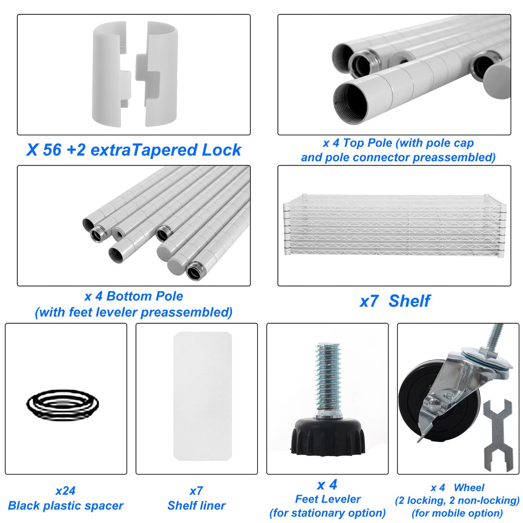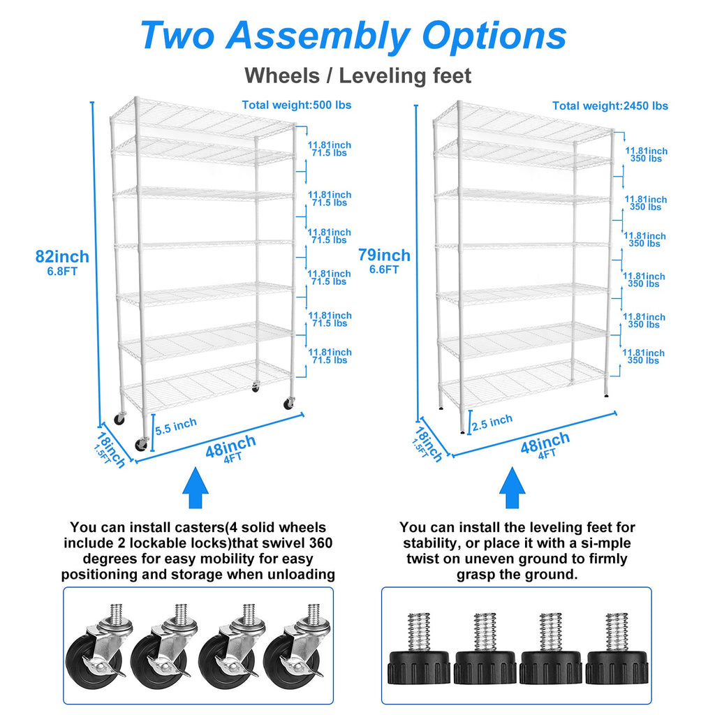 [7 TIER LARGE CAPACITY] - Heavy duty shelving with leveling feet - each layer shelf can hold 350lbs (evenly distributed), maximum load capacity is 2450 lbs. It is recommend that heavy items on the bottom shelf for maximum stability. 7 shelf Liners choice of beautiful and fun transparent colors allow you to add a pop of color to your life. Shelf Liners is waterproof - Won't get damaged from exposure to moisture. [ADJUSTABLE DESIG] - Each shelf can adjustable in 1-inch increments, adjust the shelf height according to size of the item, meet your different needs, get the best utility shelf. Create two new shelf by splitting the top pole, you can split it according to your actual needs and achieve multiple uses. [EXTREMELY DURABLE] - Wire shelving made of heavy steel, it has excellent rust resistance and oxidation resistance. Our wire shelf liner is crafted to provide unparalleled quality, longevity, function and beauty. Better quality thicker than the competition. The 7 tier shelf unit passed NSF certified, safe and reliable. Storage rack are perfect addition to home, office. [EASY MOVEMENT] - 7 tier garage shelves have 4 leveling feet, 4 3-inch industrial wheels(2 lockable). Wire rack on wheels can be easily positioned in supermarkets, garages, closets, kitchens, porch, pantry, etc. Height-adjustable leveling feet can be placed on uneven ground- simply twist to stabilize. Non-slip, will not scratch ground. [EASY TO ASSEMBLE] - With detailed instructions and no tools required, you can install it easily with another person within 15 minutes. There are many parts in the package, please feel free to contact us via Buyer Message if meet the case of missing parts and assembly.