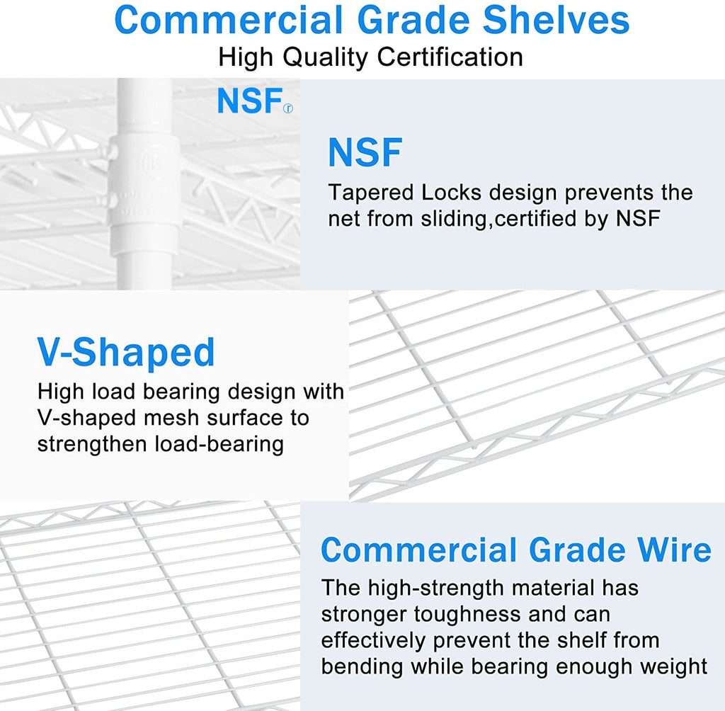 - [EXTREMELY DURABLE] - Wire shelving made of heavy steel, it has excellent rust resistance and oxidation resistance. Our wire shelf liner is crafted to provide unparalleled quality, longevity, function and beauty. Better quality thicker than the competition. The 7 tier shelf unit passed NSF certified, safe and reliable. Storage rack are perfect addition to home, office.