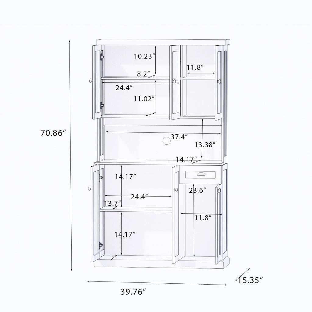 - Ample storage space: Multiple door cabinets, a sliding drawer for storing food or cutlery, and an open gray countertop shelf for microwaves, coffee machines, etc. provide amazing storage in this kitchen buffet service cabinet.