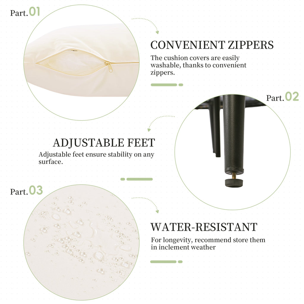 - [Comfortable Pillows&Cushions] Outfitted with four soft water-resistant cushions, each 4 inches thick, this daybed ensures maximum comfort. They are secured by magic tape and straps for stability. Accompanying these are two supportive back pillows, offering excellent back support. Their removable, zippered covers make washing and maintenance a breeze, ensuring long-lasting comfort.